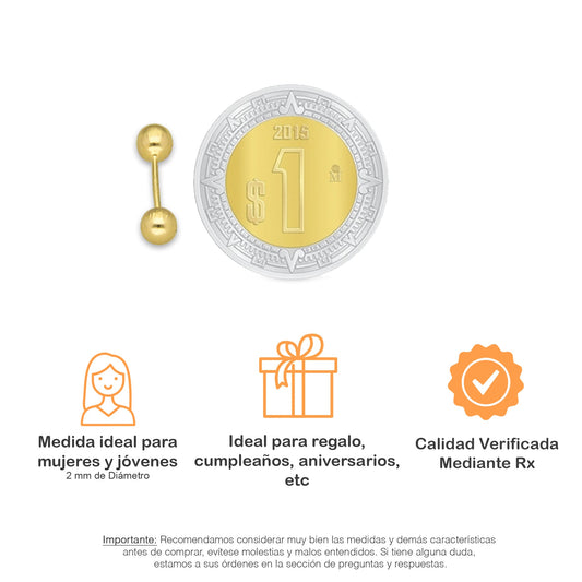MR14AB001 Arete Broquel Oro Sólido 14K Modelo Bolita Lisa Dormilona 2 mm de Diámetro