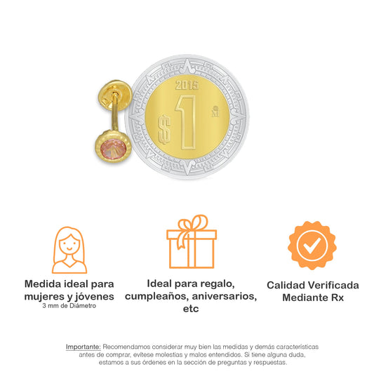 MR14AB002 Arete Broquel Oro Sólido 14K Modelo Zirconia Rosa Redonda con Bisel Diamantado 3 mm de Diámetro