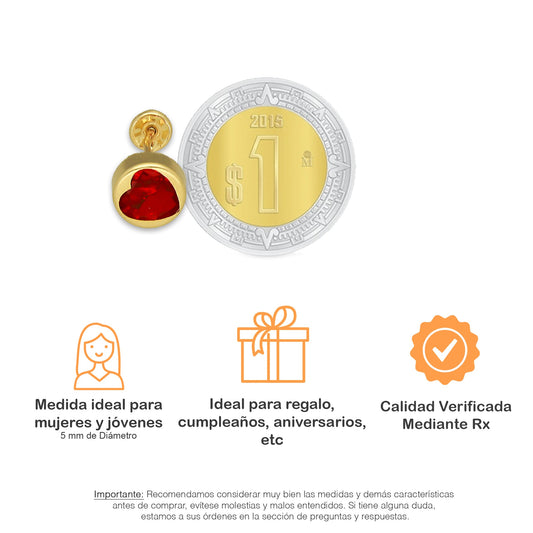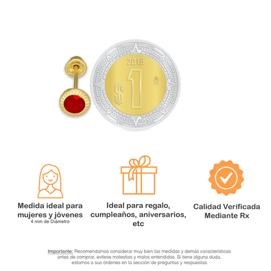 MR14AB003 Arete Broquel Oro Sólido 14K Modelo Zirconia Roja Redonda con Bisel Diamantado 4 mm de Diámetro