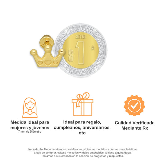 MR14AB006 Arete Broquel Oro Sólido 14K Modelo Corona 3 Puntas 7 mm de Diámetro