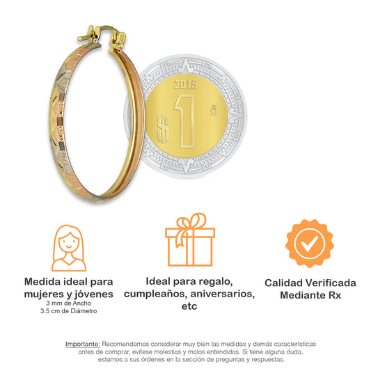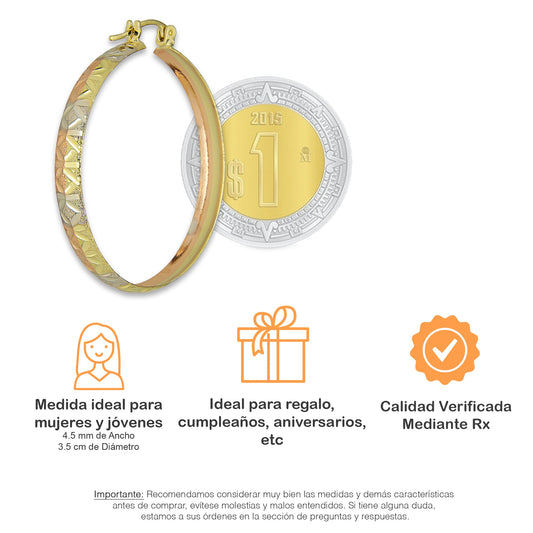 NR14AR014 Arete Arracada Oro Sólido 14K Florentino Diamantado Ancho 4.5 mm DIámetro 3.5 cm