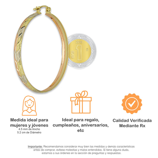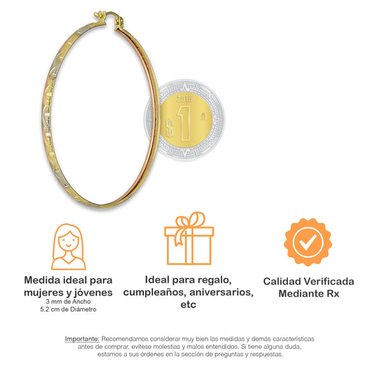 NR14AR016 Arete Arracada Oro Sólido 14K Florentino Diamantado Ancho 4.5 mm DIámetro 5.2 cm