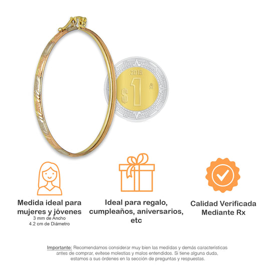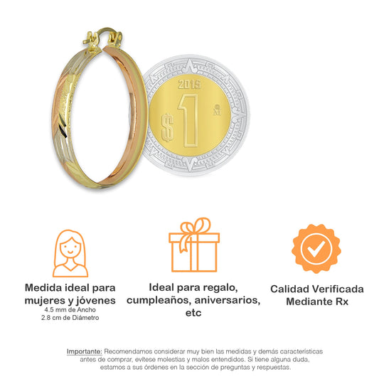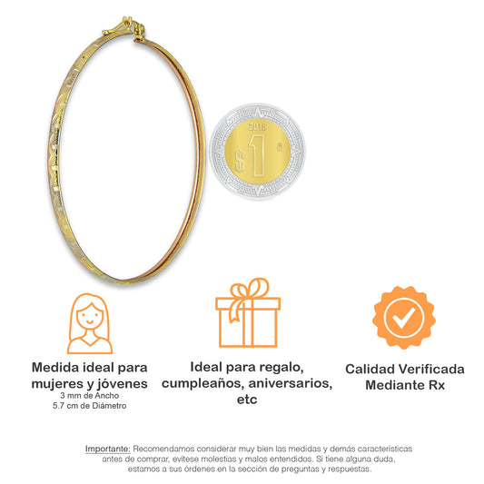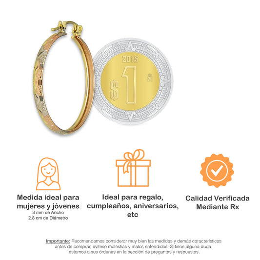 NR14AR005 Arete Arracada Oro Sólido 14K Florentino Diamantado Ancho 3 mm DIámetro 2.8 cm