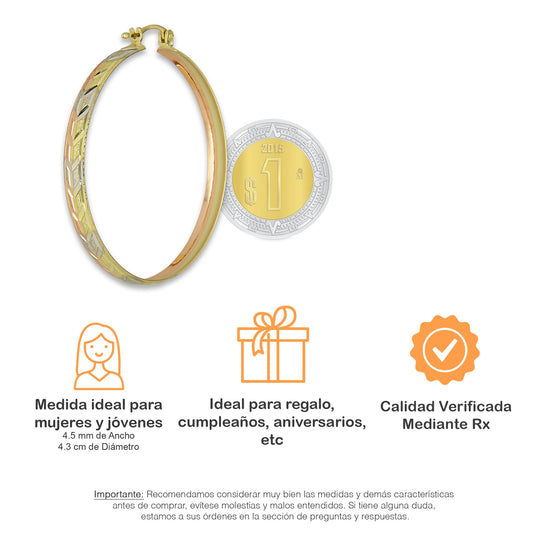 NR14AR015 Arete Arracada Oro Sólido 14K Florentino Diamantado Ancho 4.5 mm DIámetro 4.3 cm