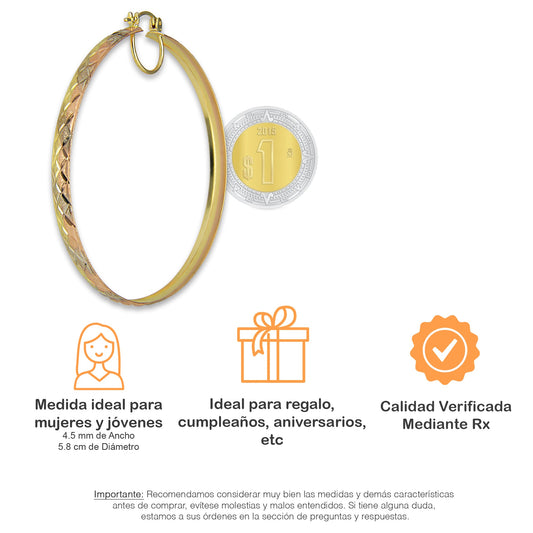NR14AR017 Arete Arracada Oro Sólido 14K Florentino Diamantado Ancho 4.5 mm DIámetro 5.8 cm