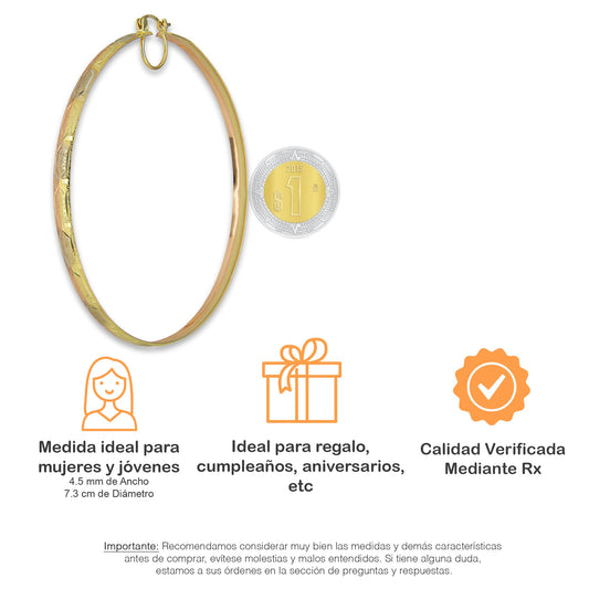 NR14AR020 Arete Arracada Oro Sólido 14K Florentino Diamantado Ancho 4.5 mm DIámetro 7.3 cm