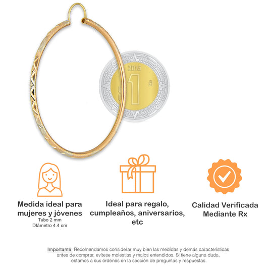 NR14AR026 Arete Arracada Oro Sólido 14K Tubo 2 mm Láser Florentino Diamantado DIámetro 4.4 cm