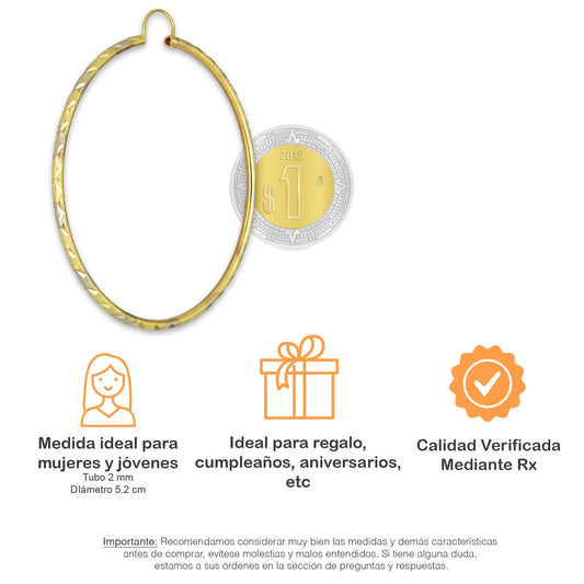 NR14AR027 Arete Arracada Oro Sólido 14K Tubo 2 mm Láser Florentino Diamantado DIámetro 5.2 cm