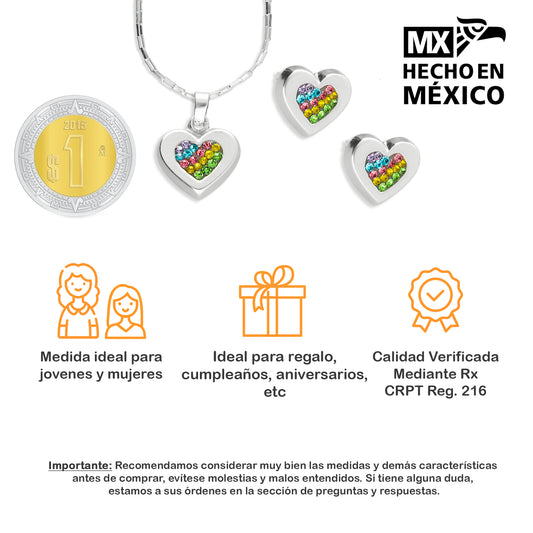 LPADJ048 Set Aretes + Dije + Cadena Corazón Cristales Multicolor en Plata Ley .925 2085850029