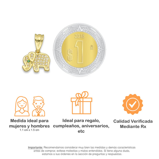 NR14DJ138 Dije Oro Sólido 14K Elefante Manto ZIrconias Verdes 1.7 cm x 2 cm