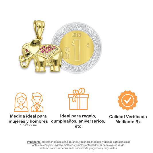 NR14DJ137 Dije Oro Sólido 14K Elefante Manto ZIrconias Rojas 1.7 cm x 2 cm