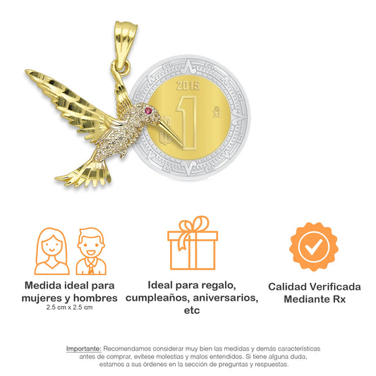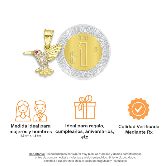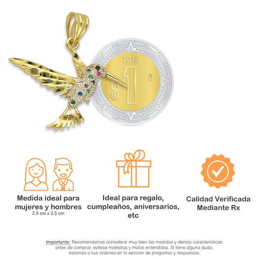 NR14DJ145 Dije Oro Sólido 14K Colibrí Alas y Cola Diamantada Multicolor 2.5 cm x 2.5 cm