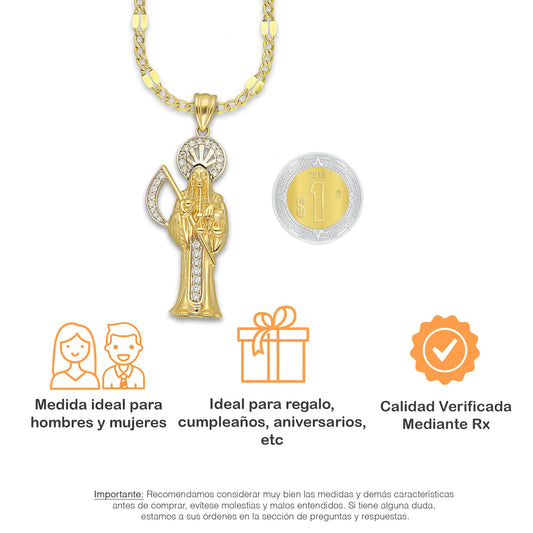 MR14DP100 Cadena Dama Oro Sólido 10K + Dije Oro Sólido 14K EM Santa Muerte con Zirconia 1.8 cm x 5.1 cm