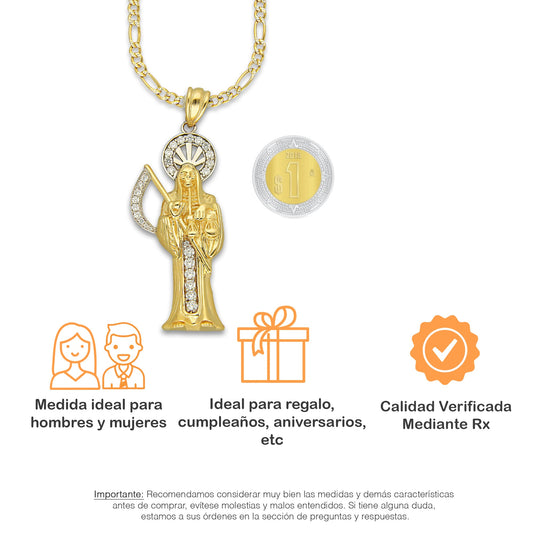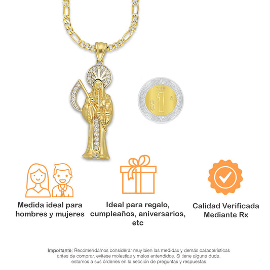MR14DP099 Cadena Caballero Oro Sólido 10K + Dije Oro Sólido 14K EM Santa Muerte con Zirconia 2.2 cm x 6.1 cm