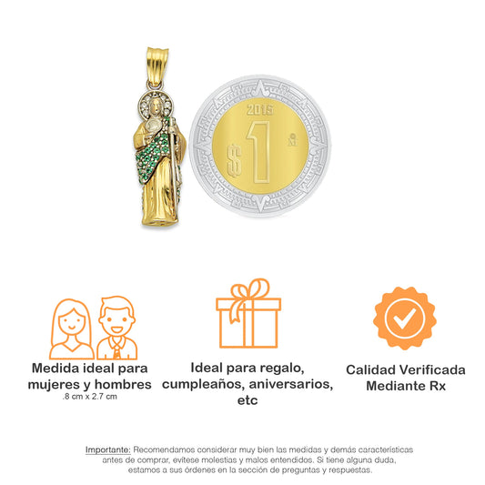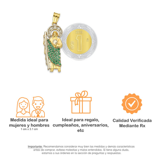 MR10DP097 Cadena Oro Sólido 10K + Dije Oro Sólido 10K EMF10 San Judas Tadeo Manto con Zirconias Verdes 1 cm x 3.1 cm