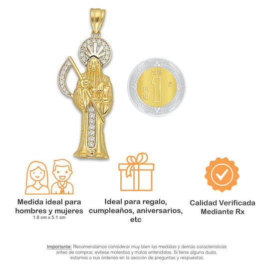 MR14DJ195 Dije Oro Sólido 14K EM Santa Muerte con Zirconia 1.8 cm x 5.1 cm