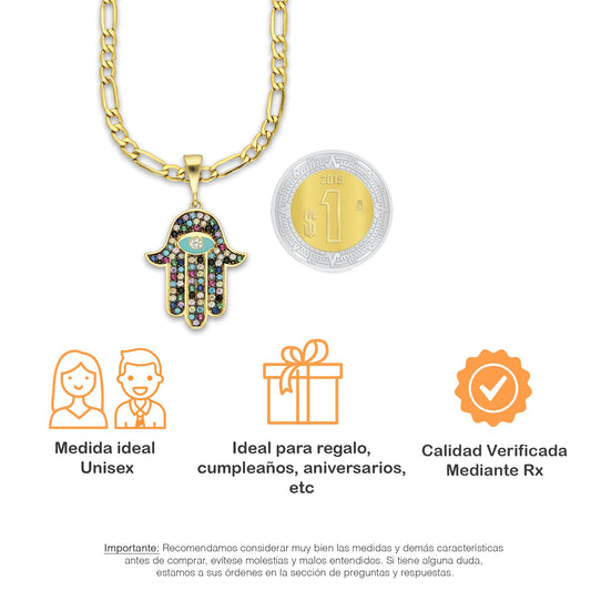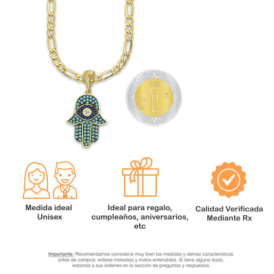 MR14DP084 Cadena Oro Sólido 10K + Dije Oro Sólido 14K EM Mano de Fatima Azul Ojo Azul Turqueza 1.8 cm x 3.1 cm