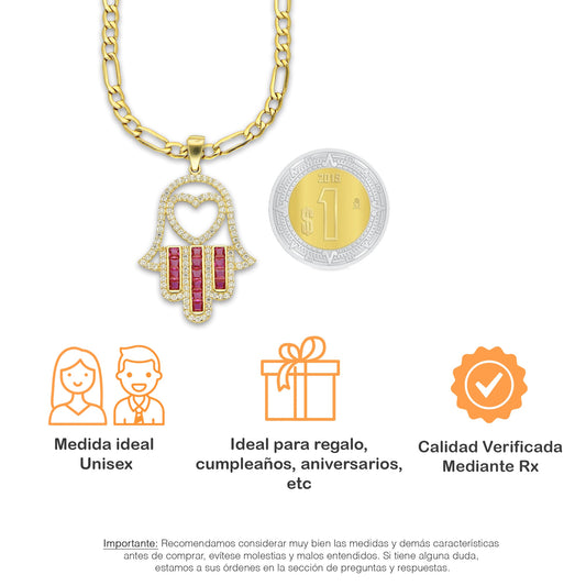 MR14DP085 Cadena Oro Sólido 10K + Dije Oro Sólido 14K EM Mano de Fatima Azul Centro Corazón 2.2 cm x 3.6 cm