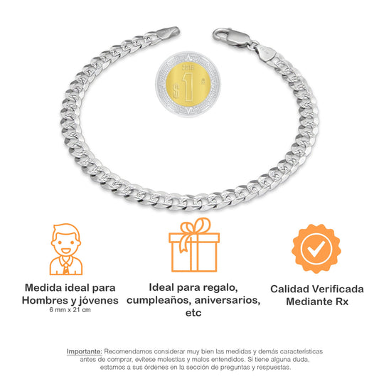 MR14PC034 Pulsera Para Caballero Oro Sólido 14K Mod Cubana Americana DIamantada Oro Blanco 6 mm x 21 cm