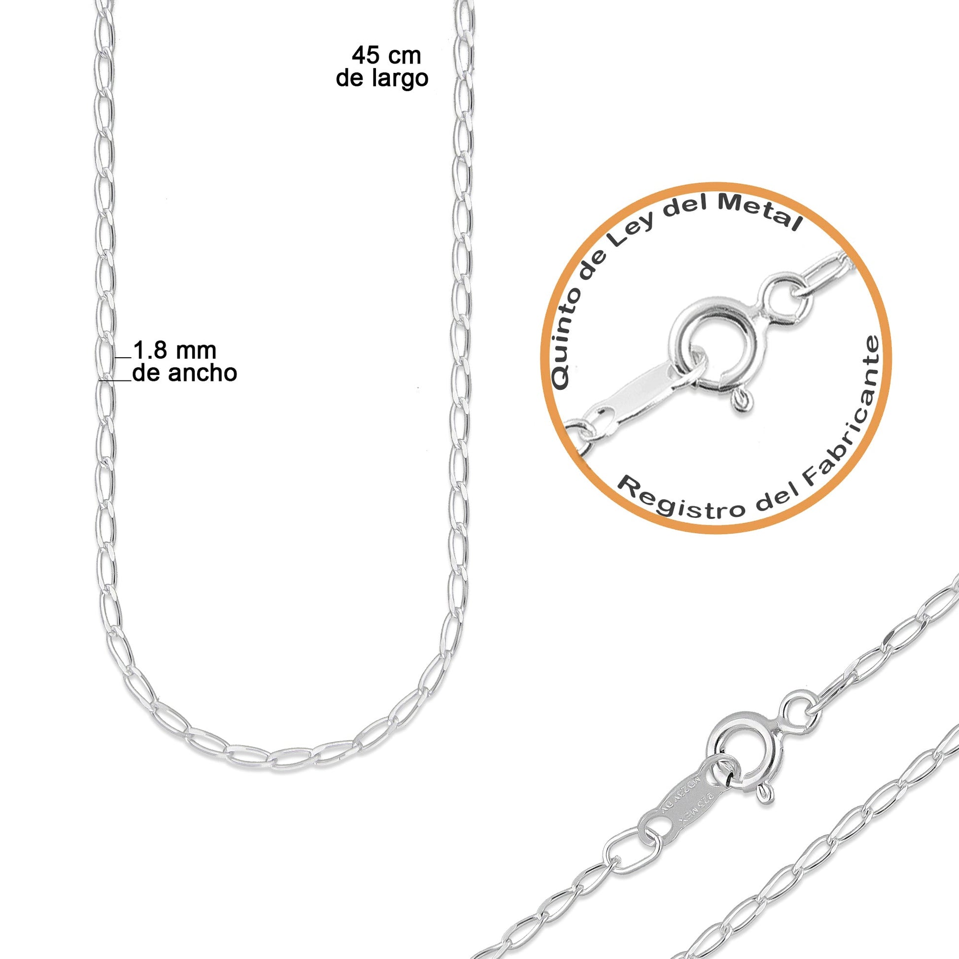 - Cadena: 45 cm de largo x 1.8 mm de ancho