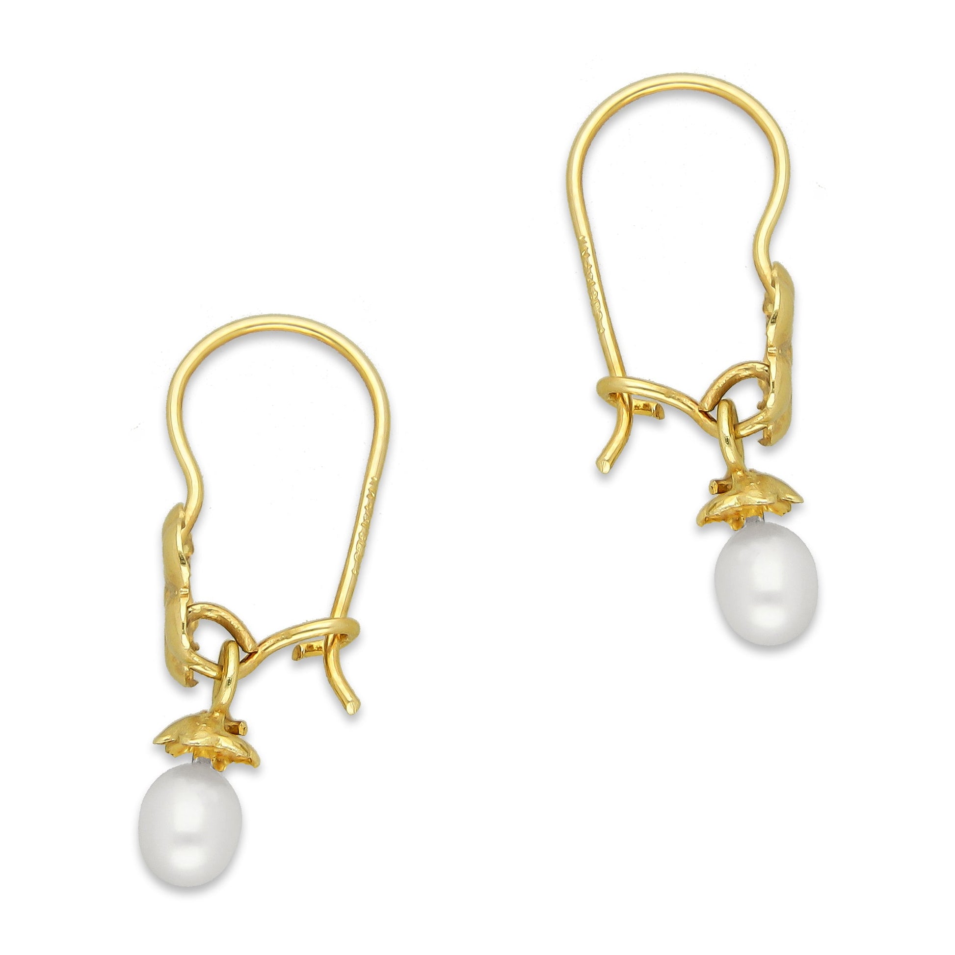 MR10AR014 Arete Arillo Oro Sólido 10K Modelo Flor 5p Lisa con Perla Colgante 2.2 cm de Diámetro