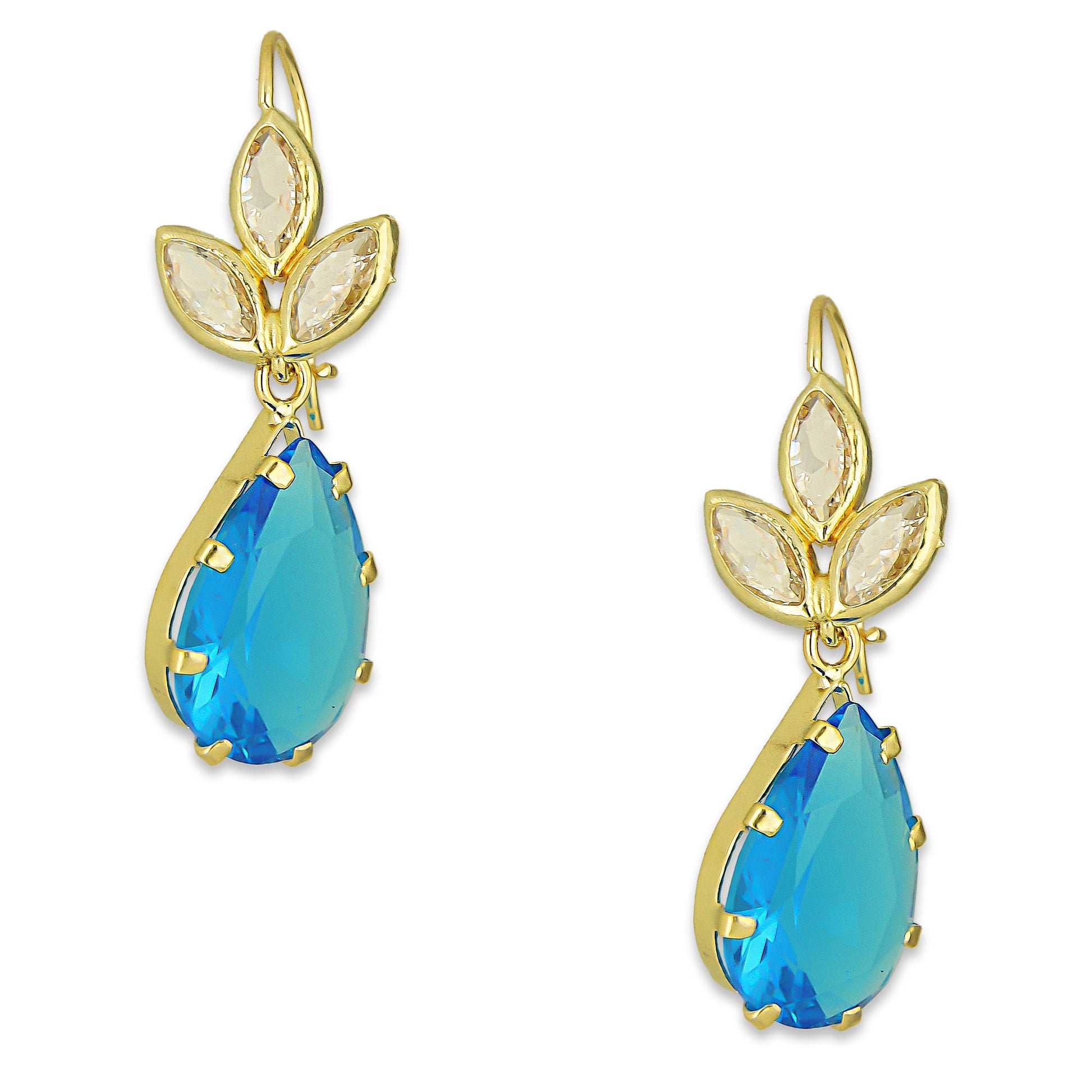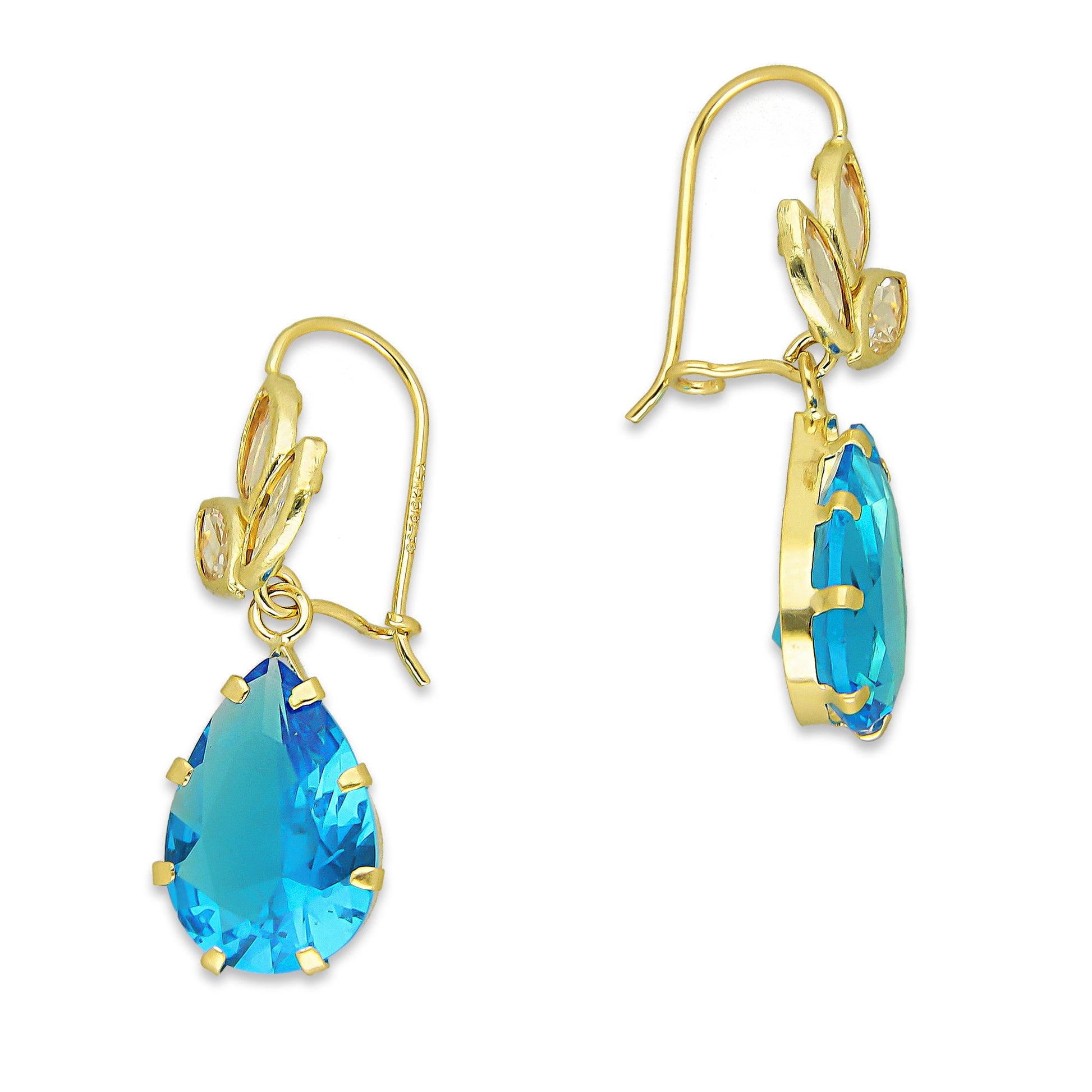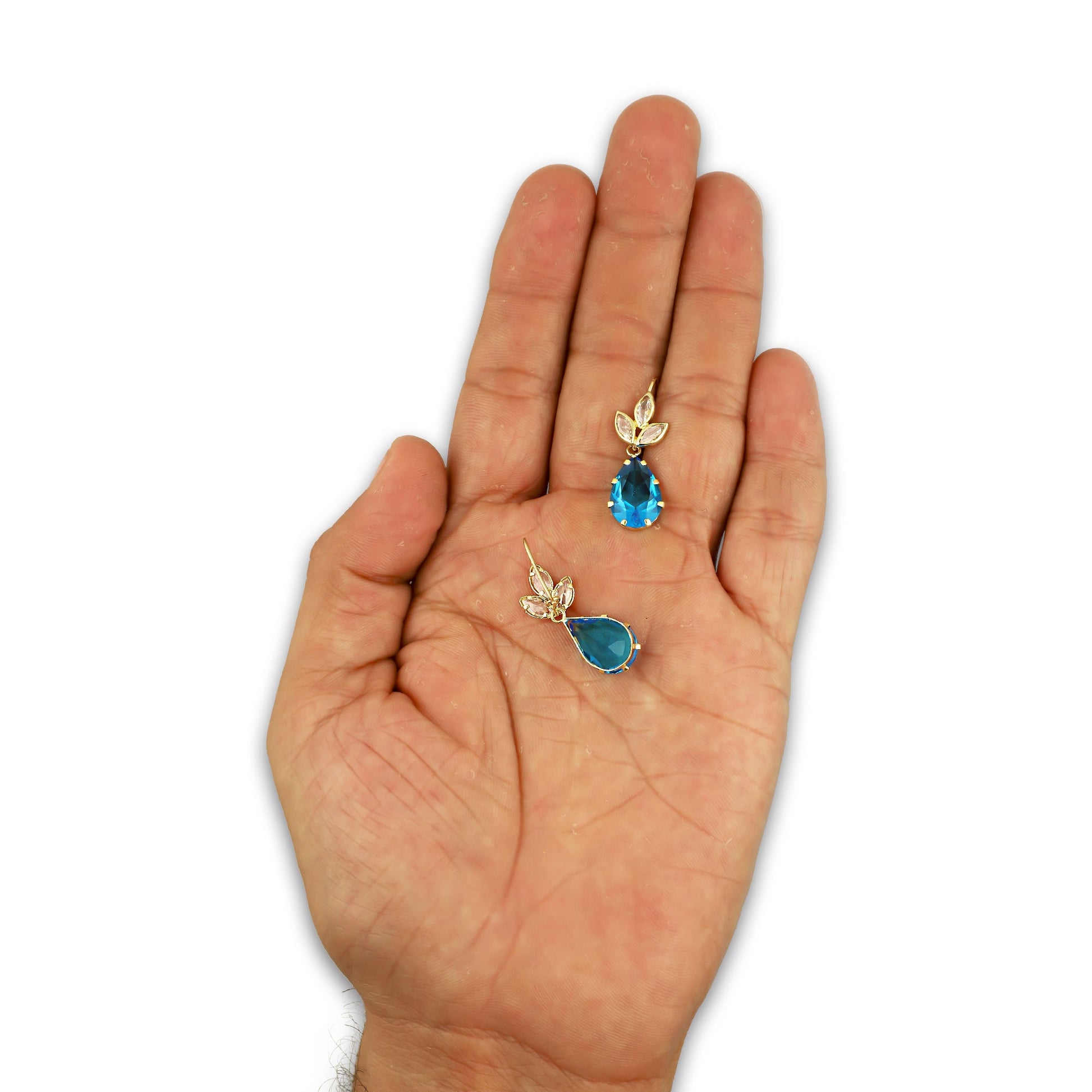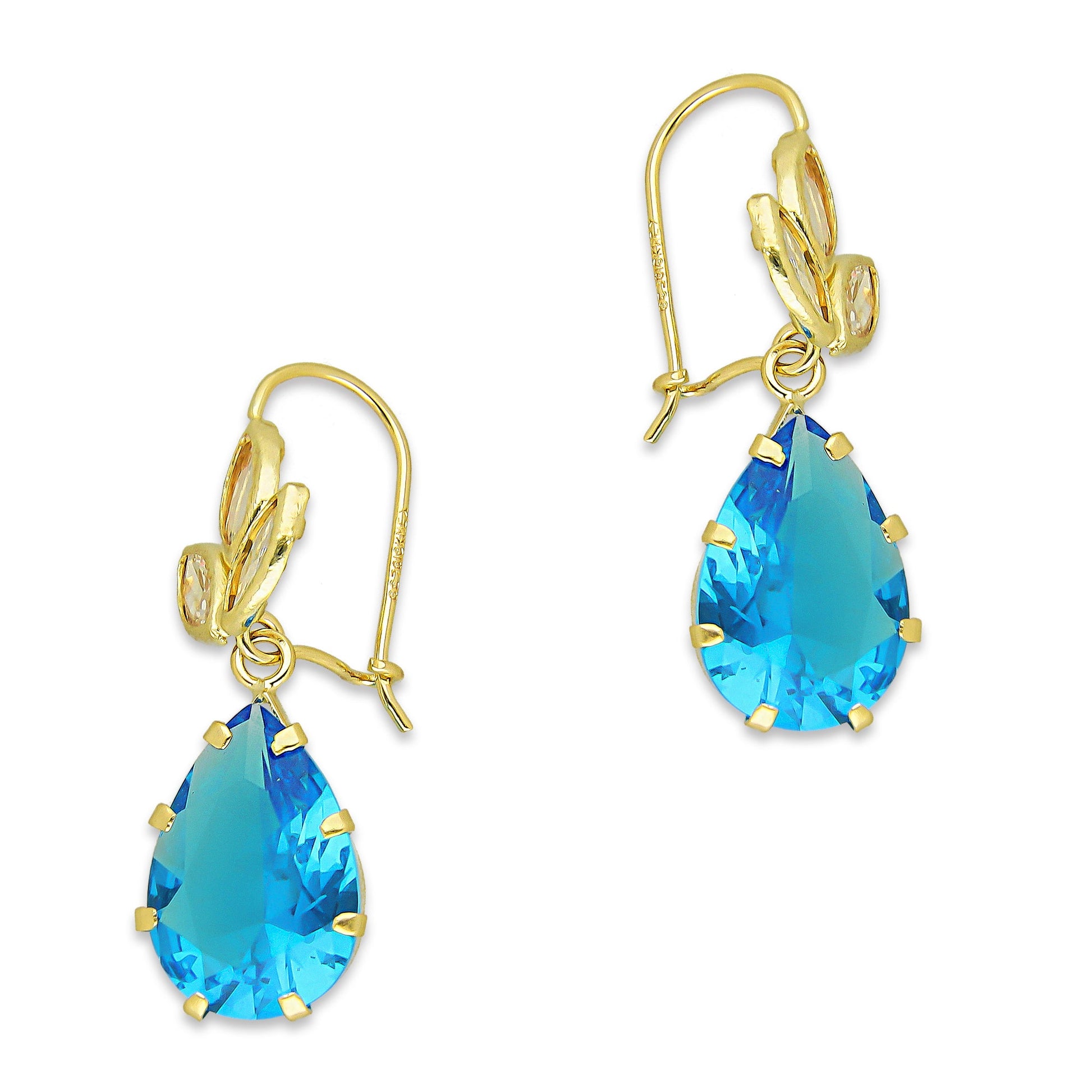 MR10AR027 Arete Arillo Oro Sólido 10K Modelo 3 Hojitas con Gota Azul Colgante 3 cm de Diámetro