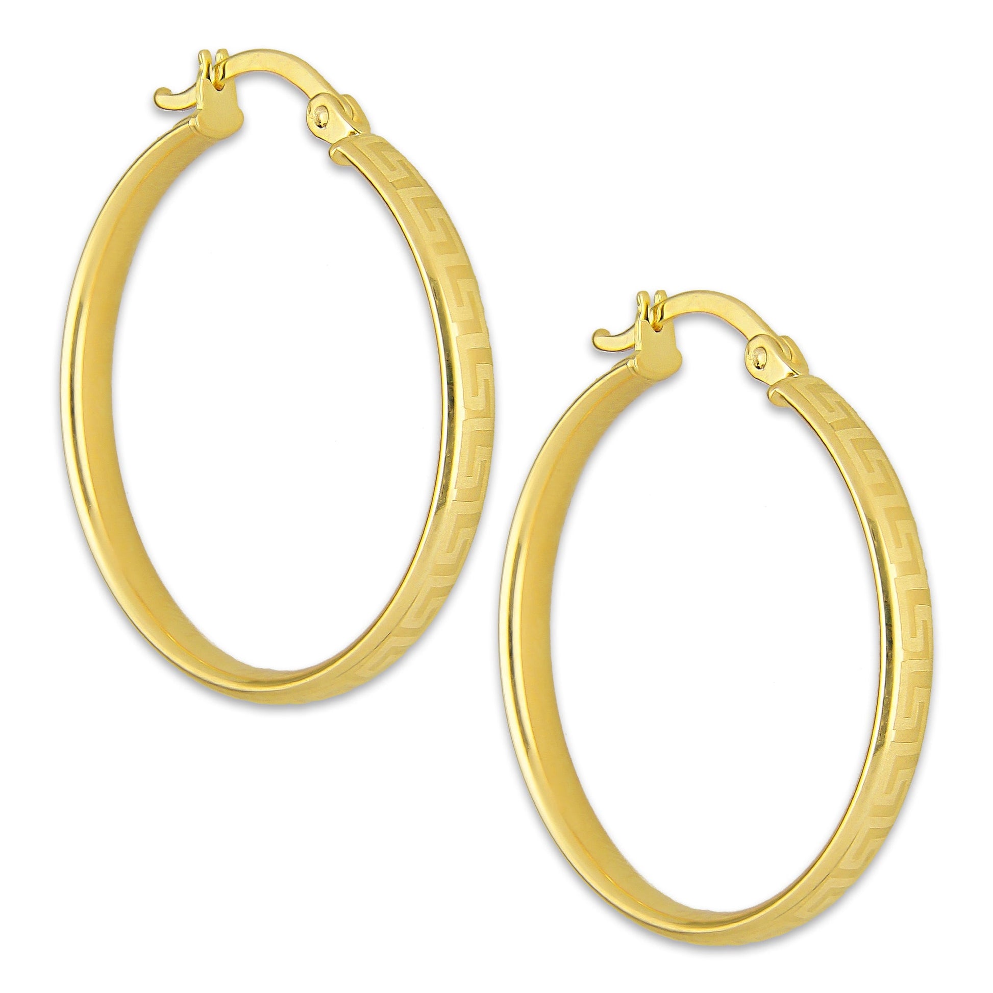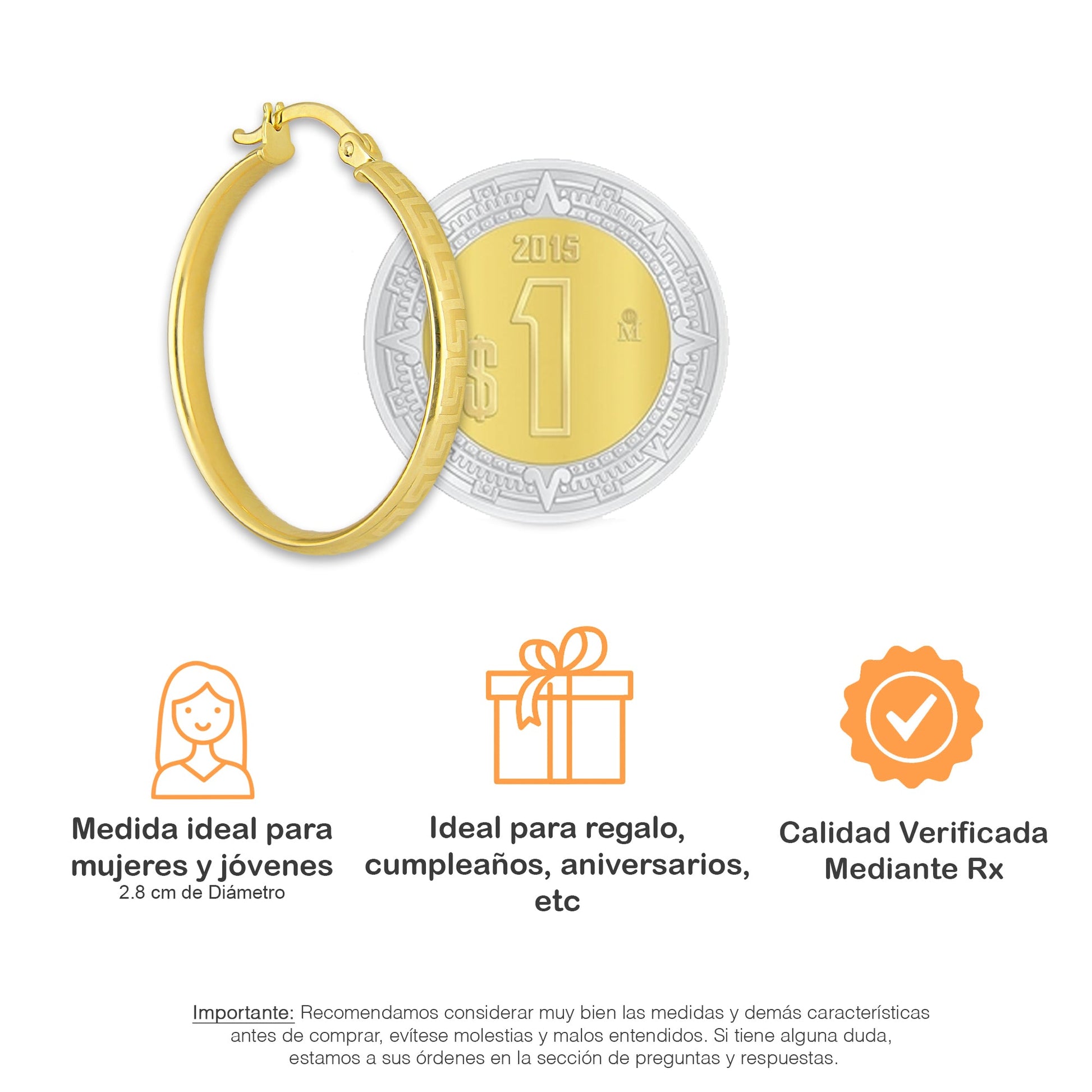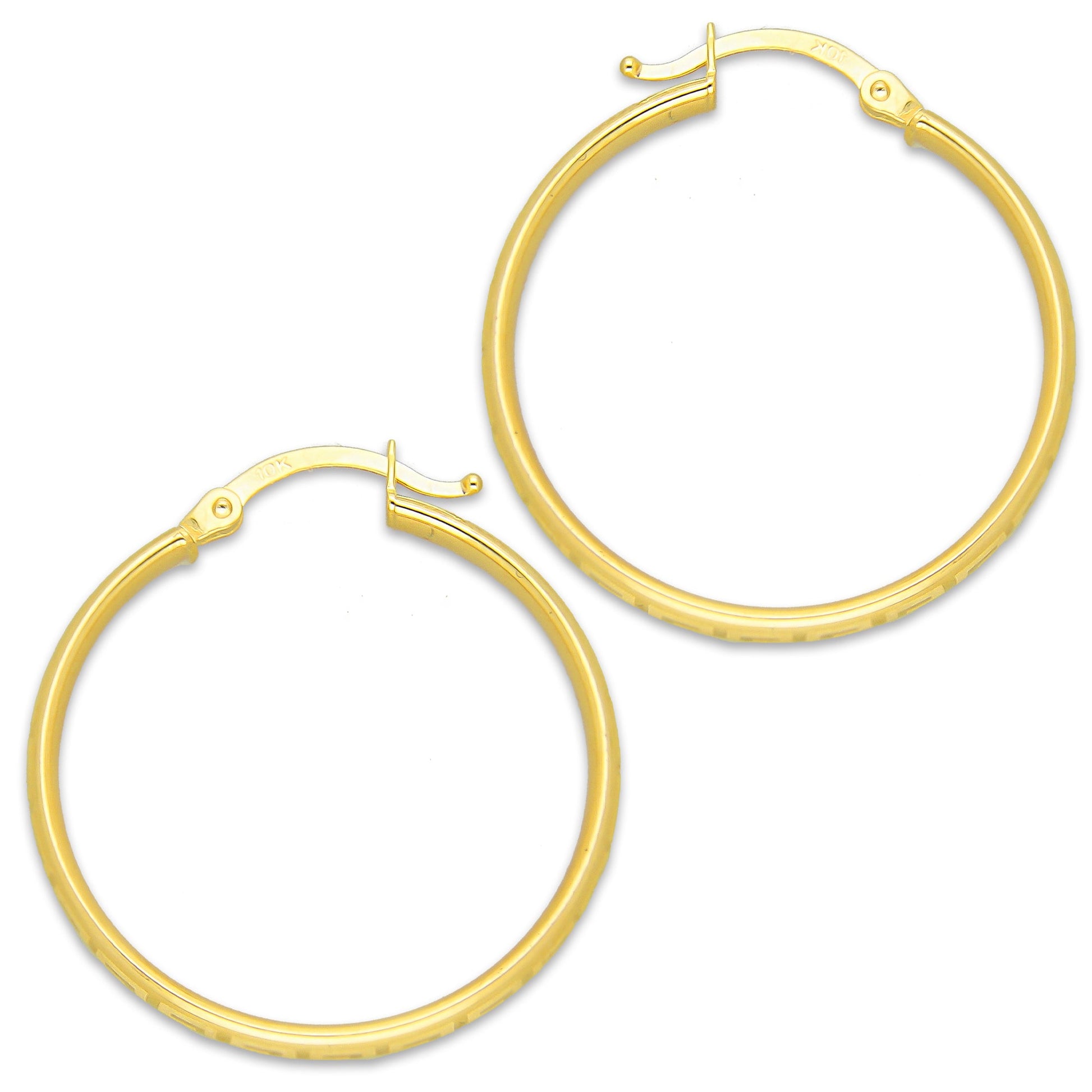 MR10AR041 Arete Arracada Oro Sólido 10K EMF10 Modelo. Tubo Óvalado Grecas Diámetro 2.8 cm