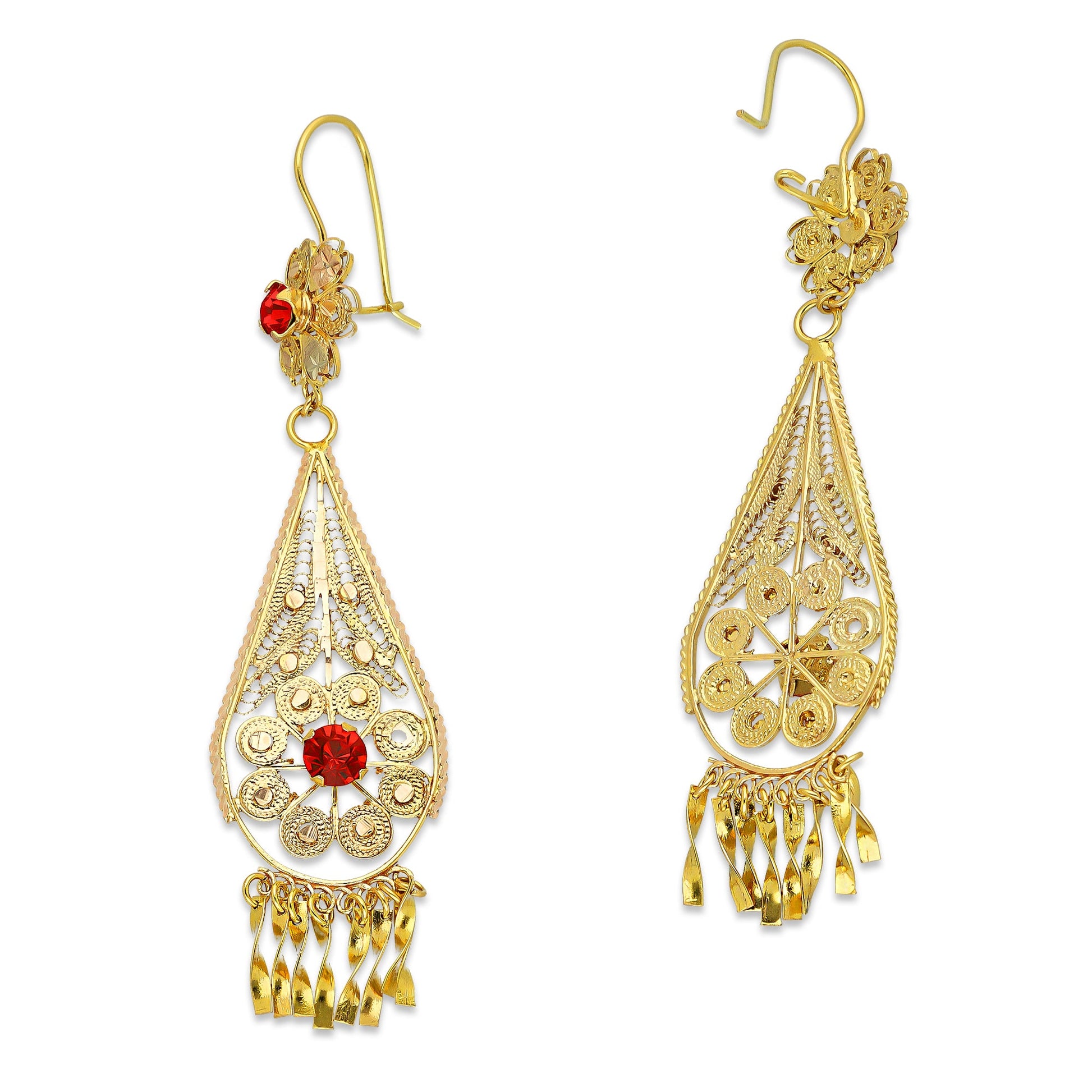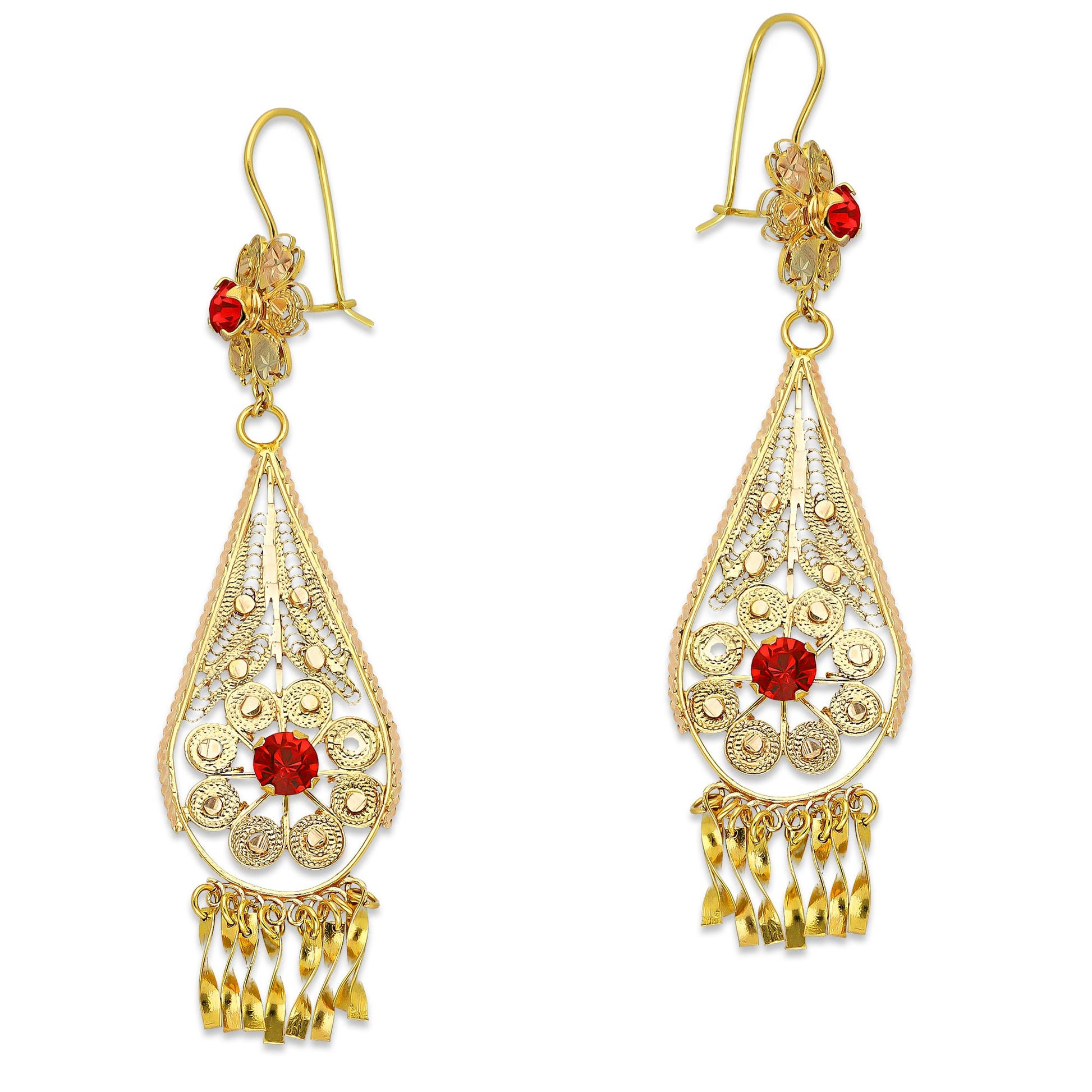MR10AR043 Arete Arracada Oro Sólido 10K Modelo Flor con Gota Colgante Piedras Rojas Diámetro 8.8 cm