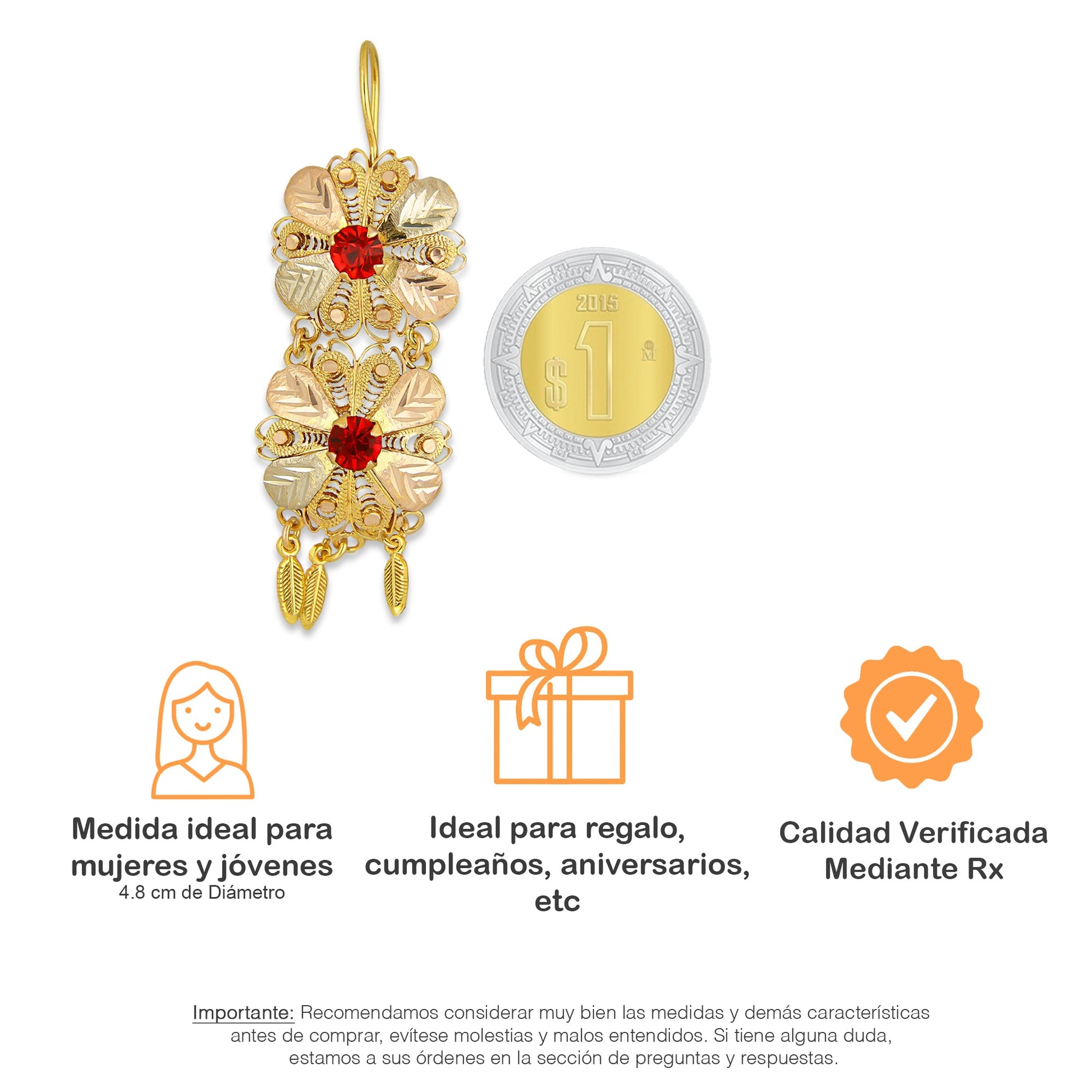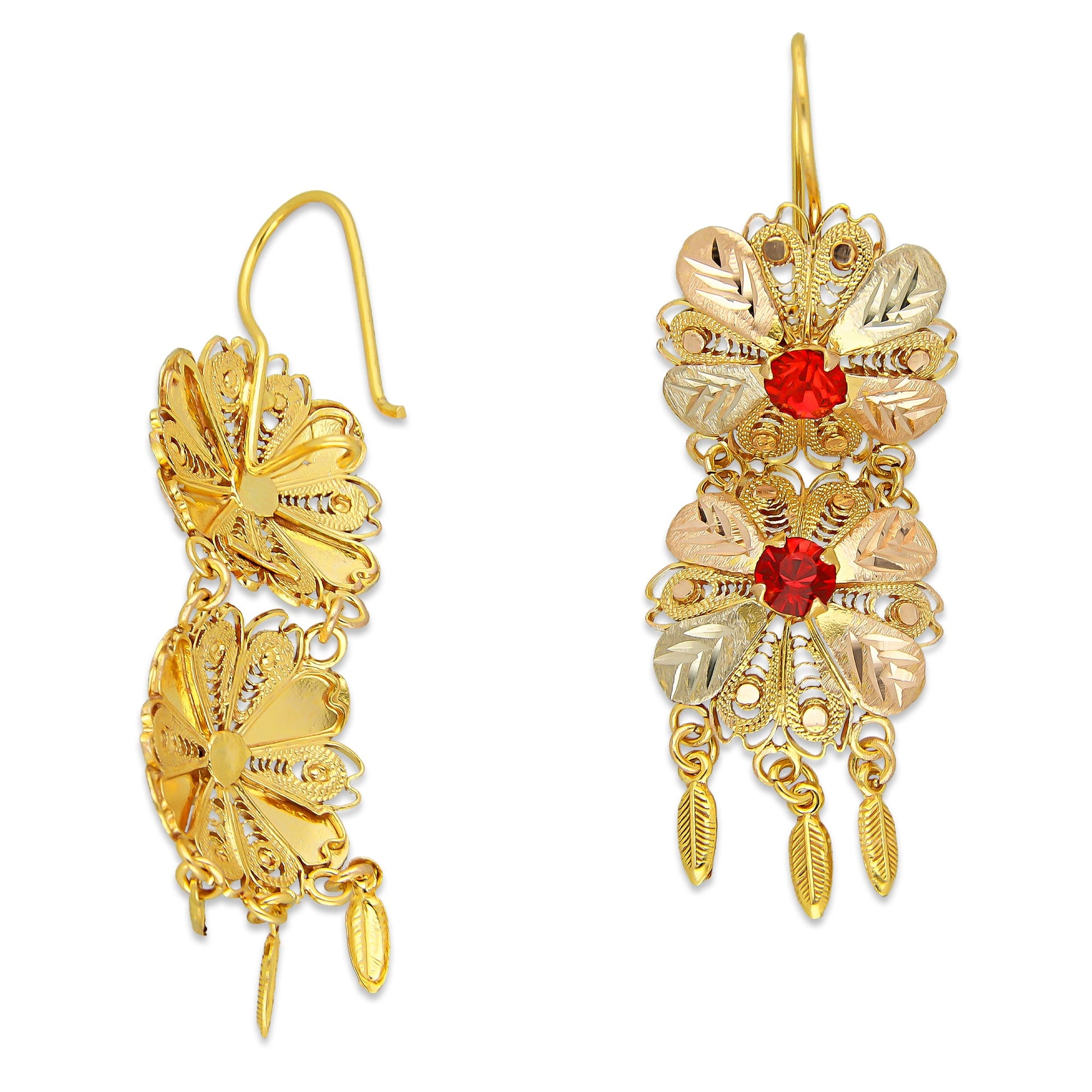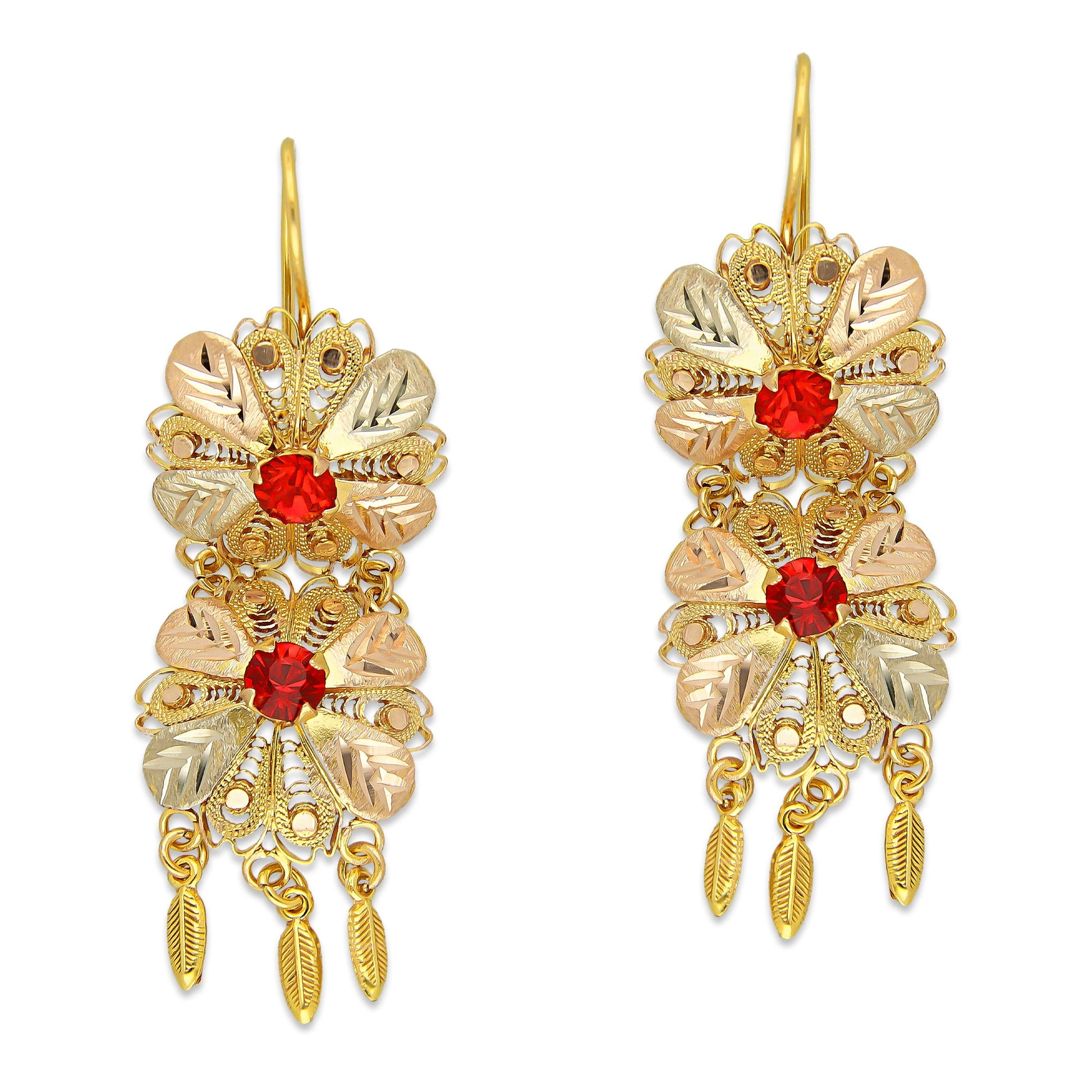 MR10AR048 Arete Arracada Oro Sólido 10K Modelo 2 Flores con 3 Hojas Colgantes y Piedras Rojas Diámetro 4.8 cm