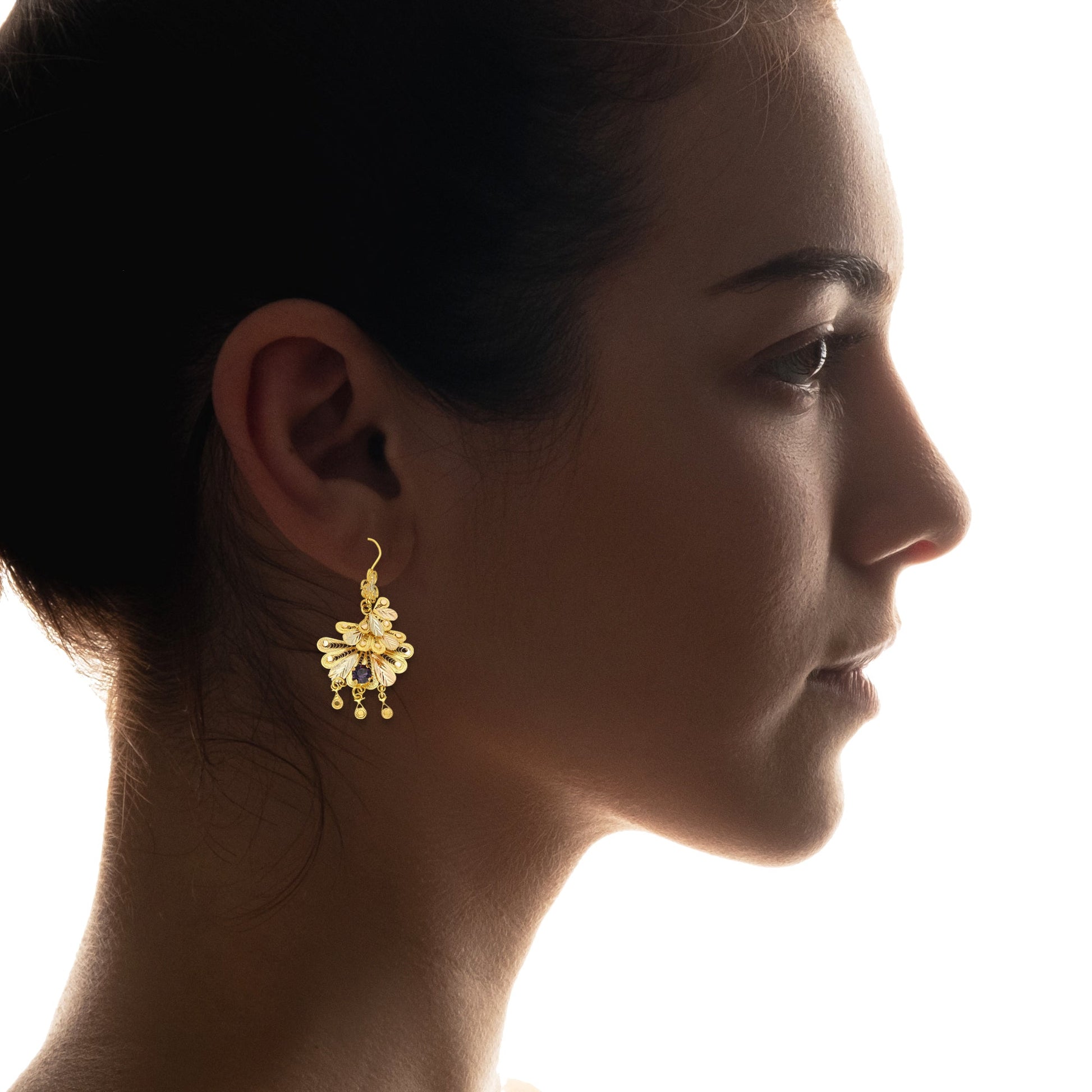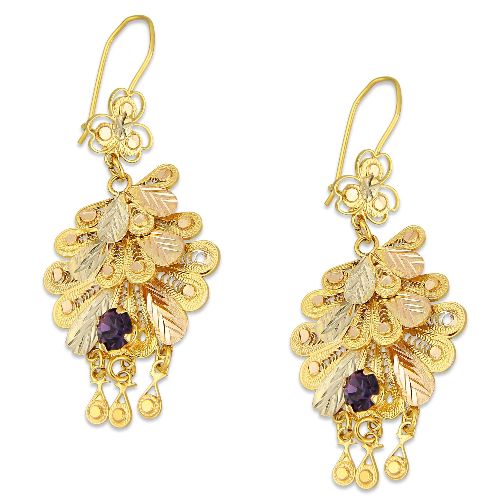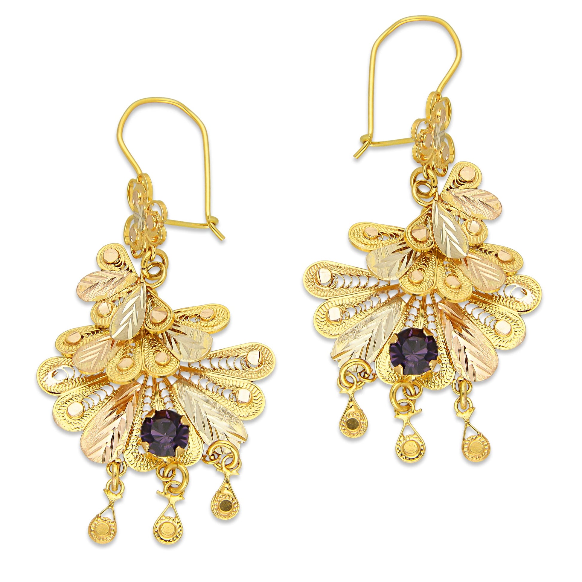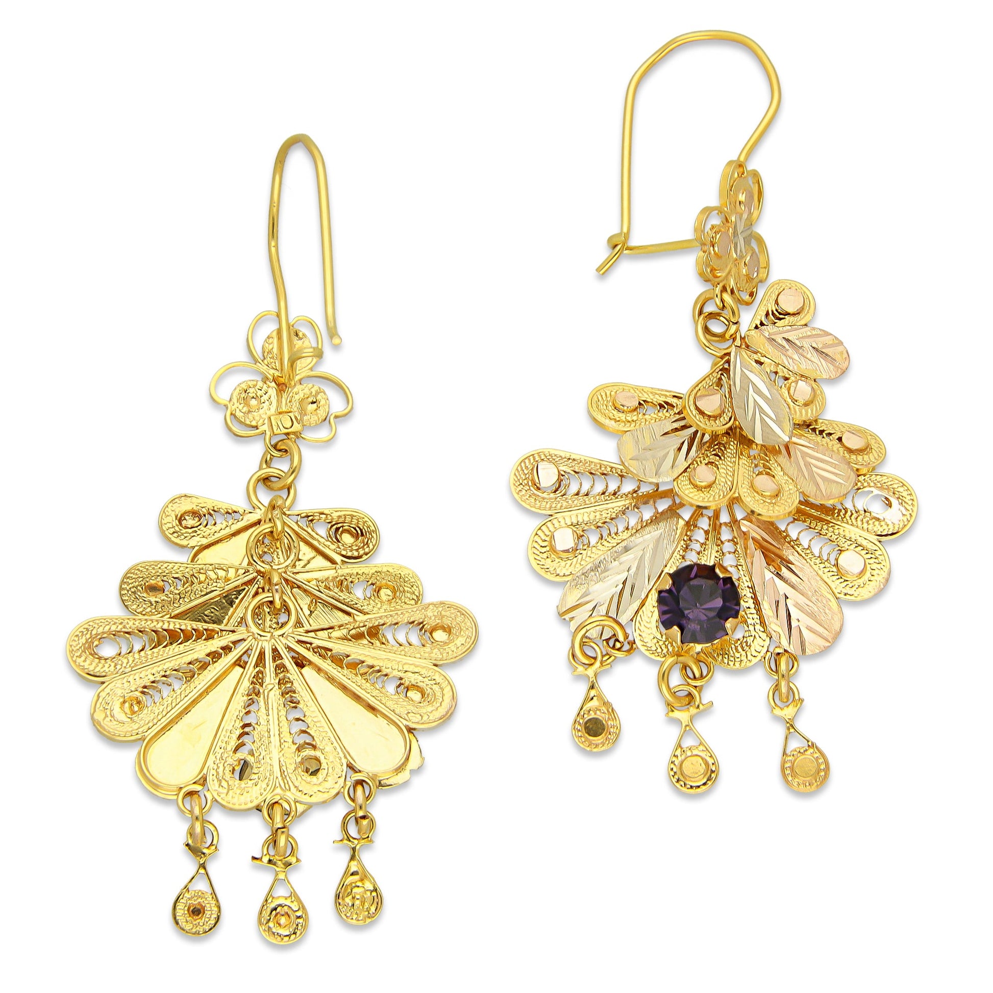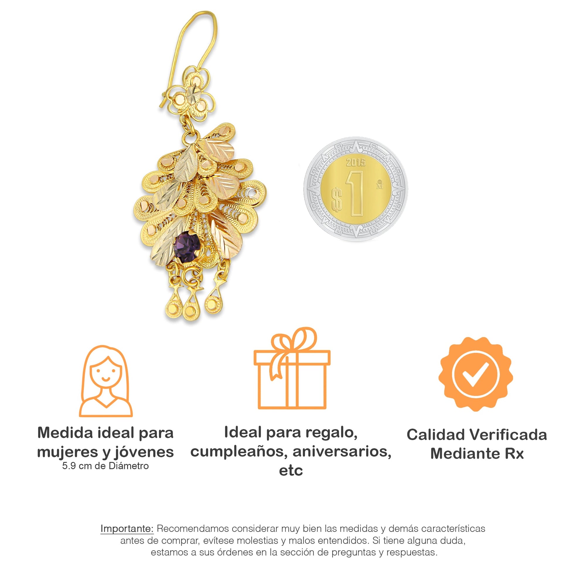 MR10AR051 Arete Arracada Oro Sólido 10K Modelo Abanicos con 3 Círculos Colgantes Diámetro 5.9 cm