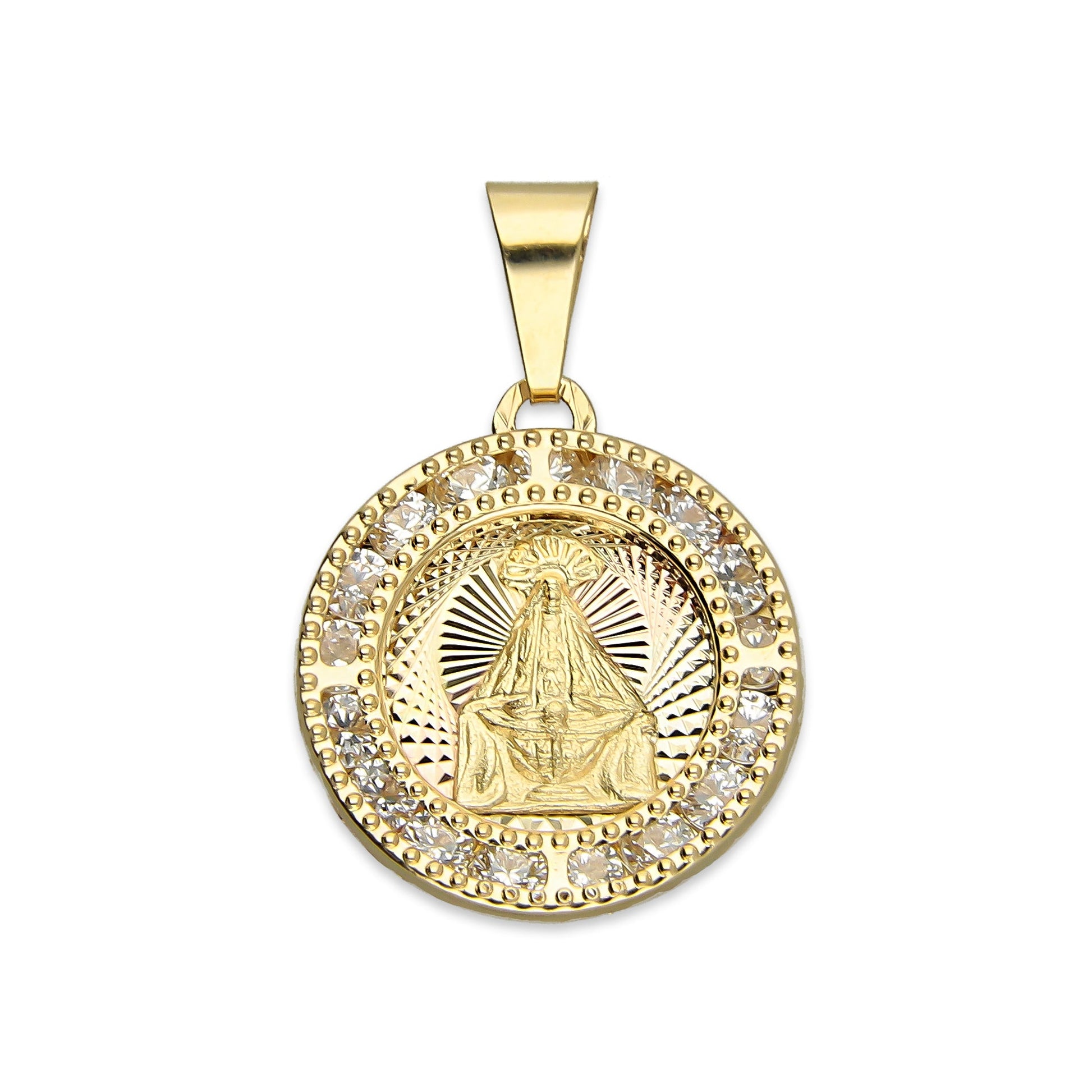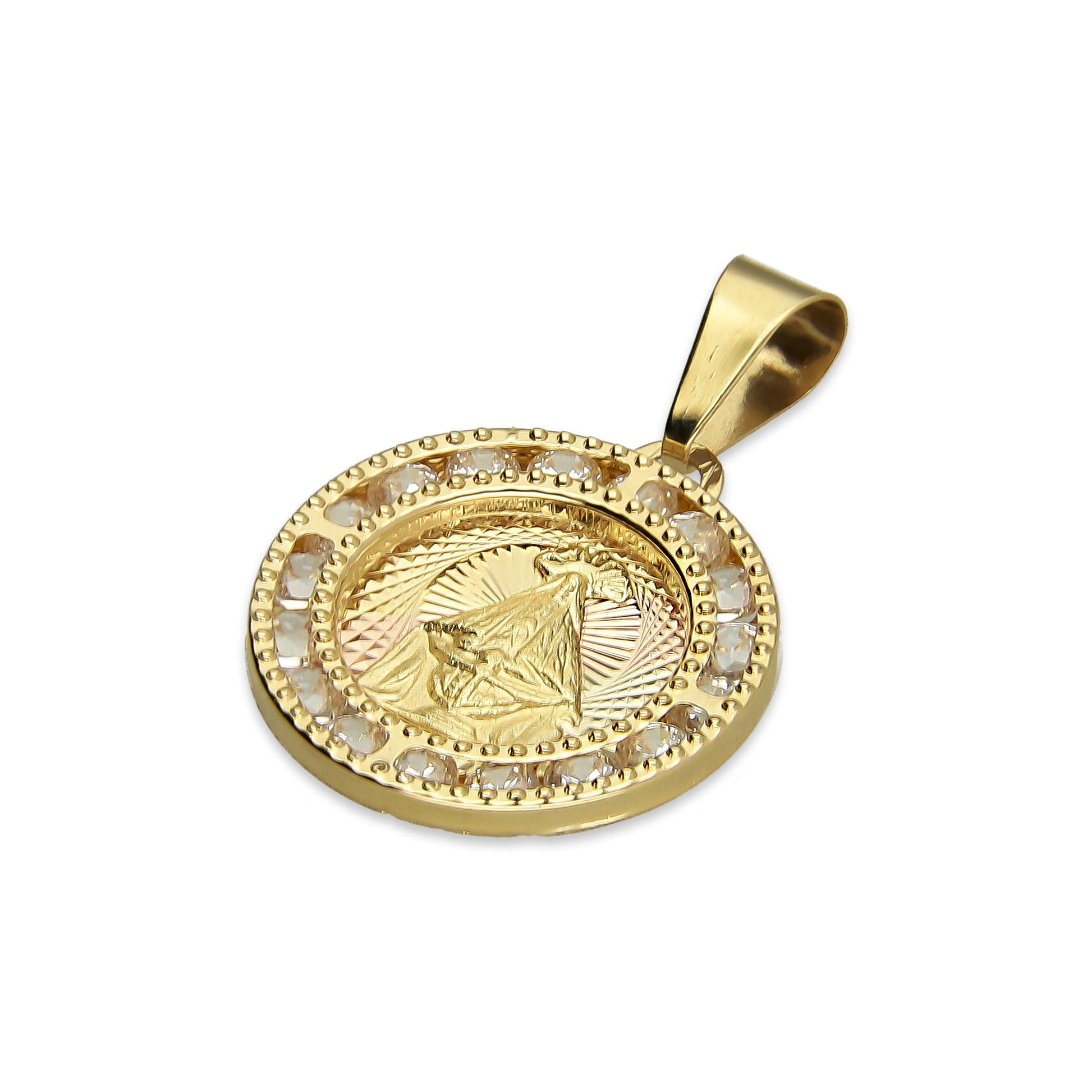 MR14DJ017 Dije Medalla Redonda Oro Sólido 14K Virgen Juquila Zirc Perl 1.5 x 2.3 cm