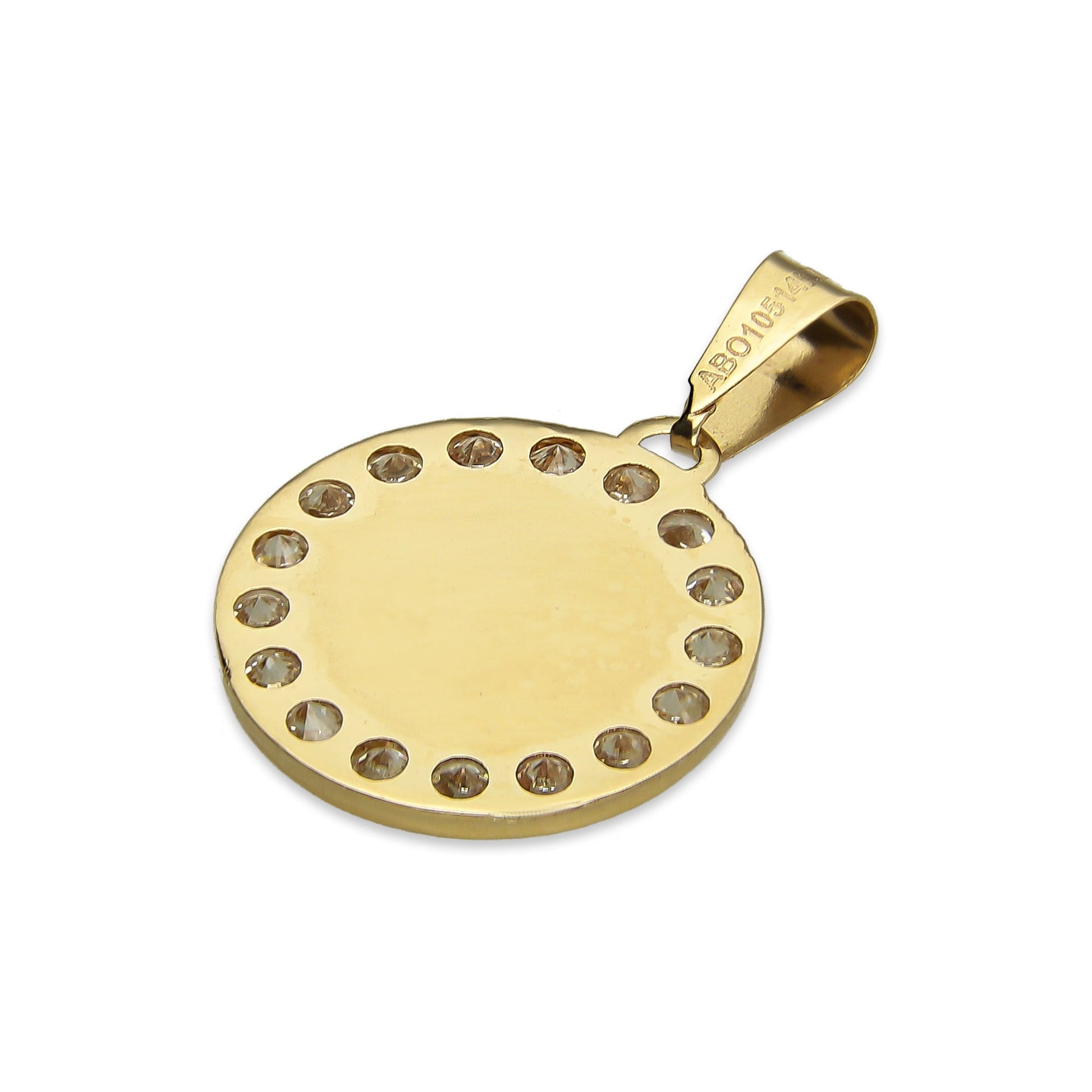 MR14DJ020 Dije Medalla Redonda Oro Sólido 14K Bautizo Zirc Perl 1.5 x 2.3 cm