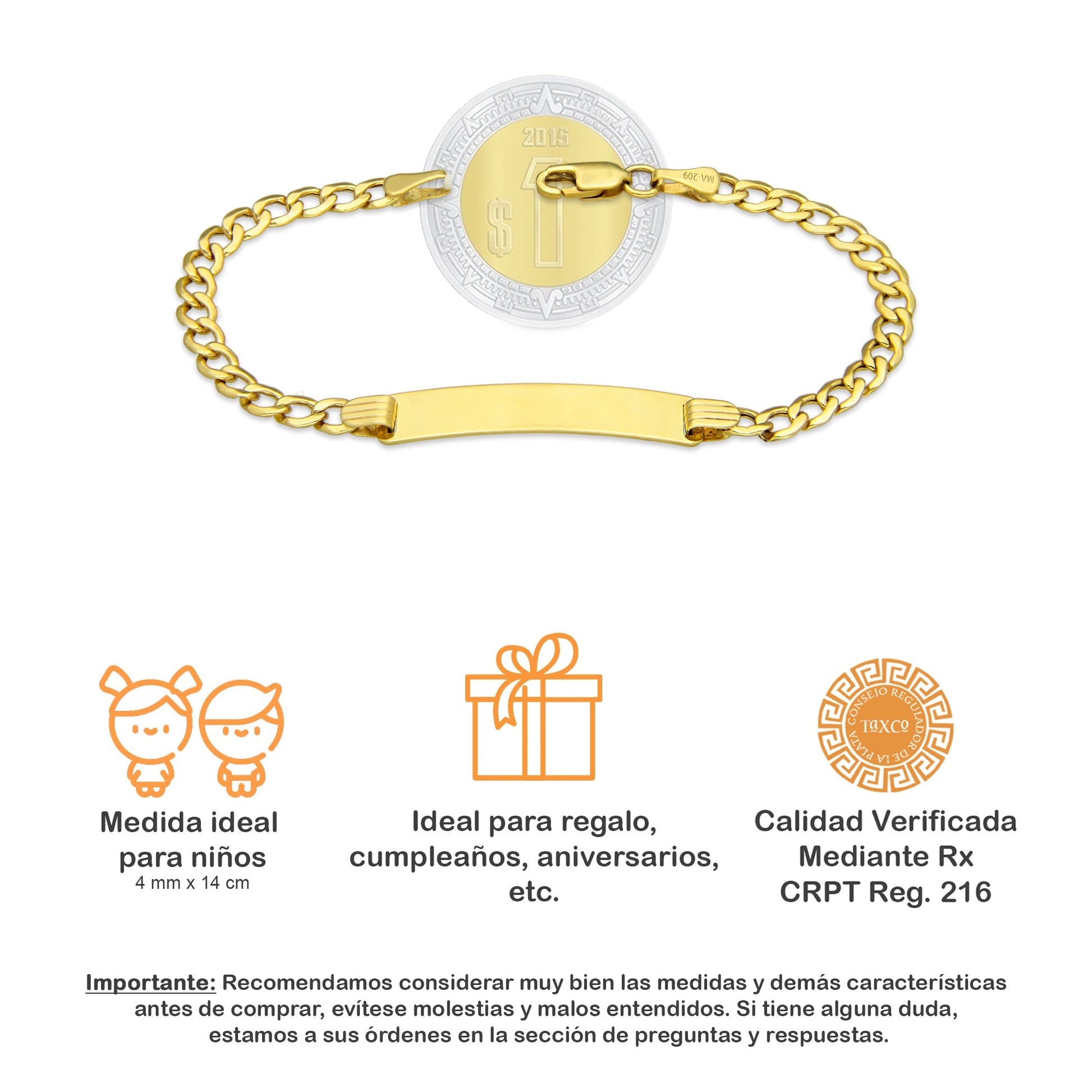 MR10PN001 Pulsera Esclava NIños Oro Sólido 10K EMF10 Modelo Figaro 1*0 4 mm x 14 cm