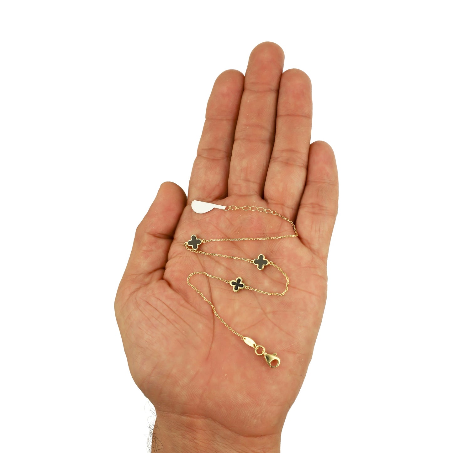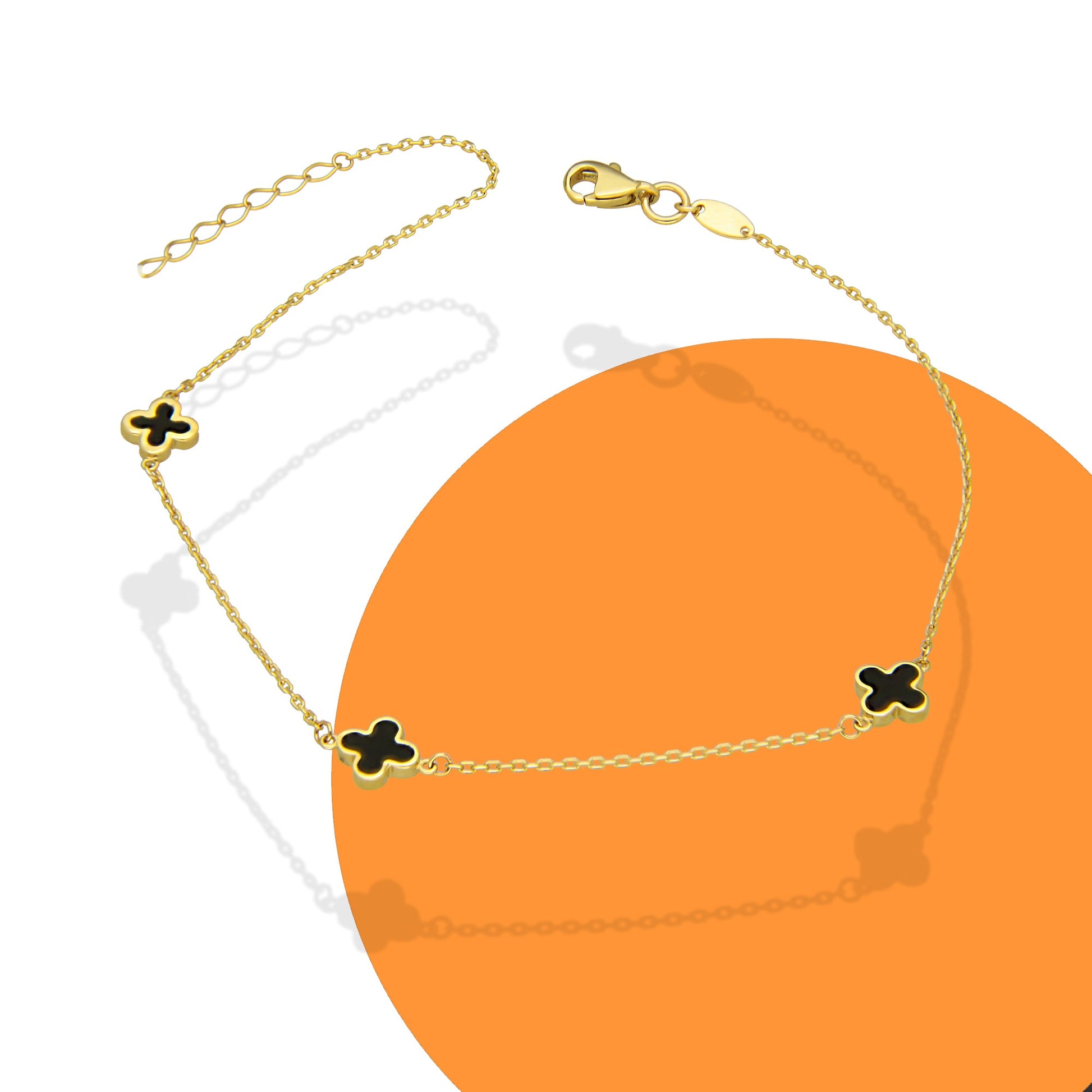 MR10TB013 Pulsera Tobillera Dama Oro Sólido 10K Mod Trébol Esmaltado Negro 6 mm Largo Ajustable 23 a 25 cm