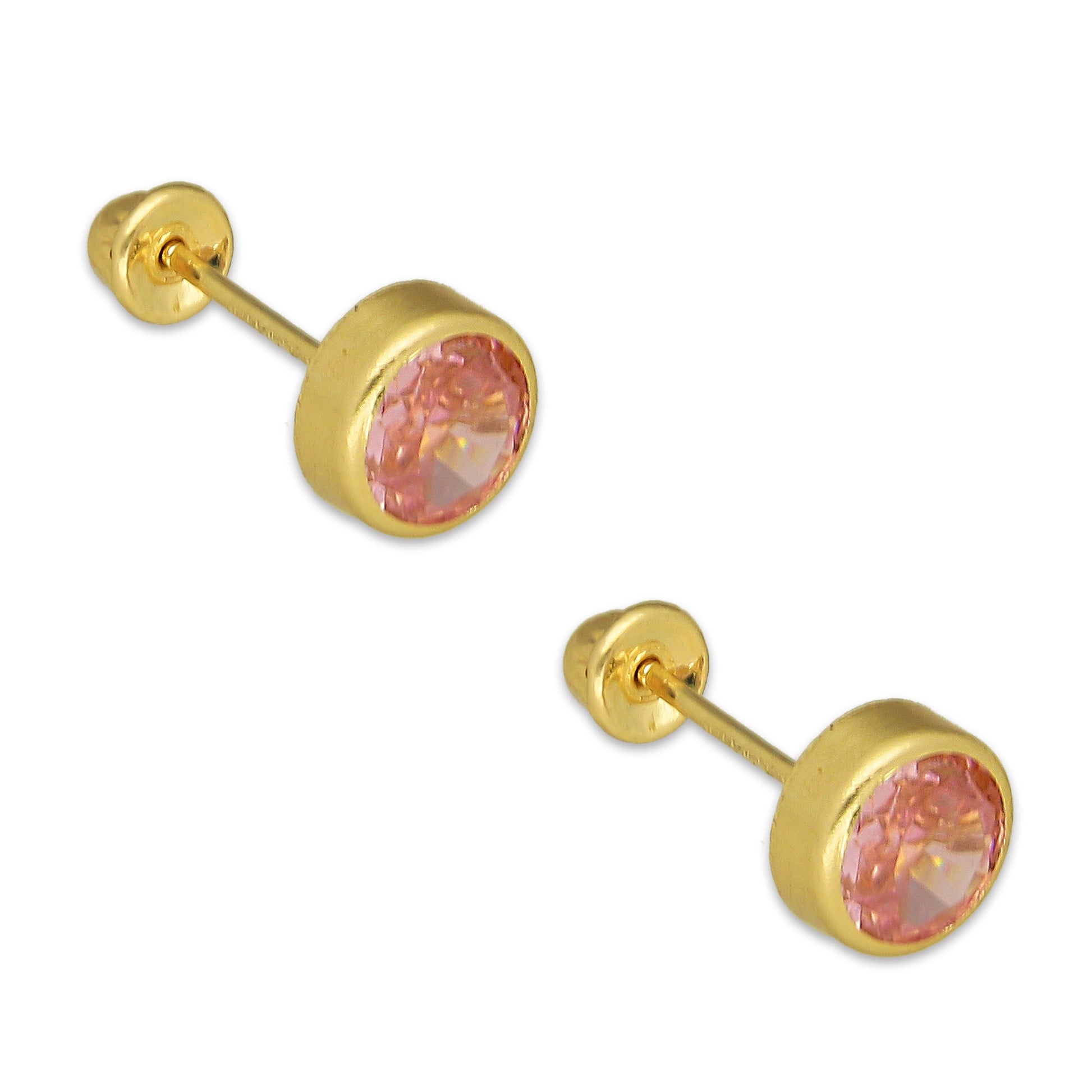 MR14AB012 Arete Broquel Oro Sólido 14K Modelo Zirconia Rosa Redonda con Bisel Liso 5 mm de Diámetro