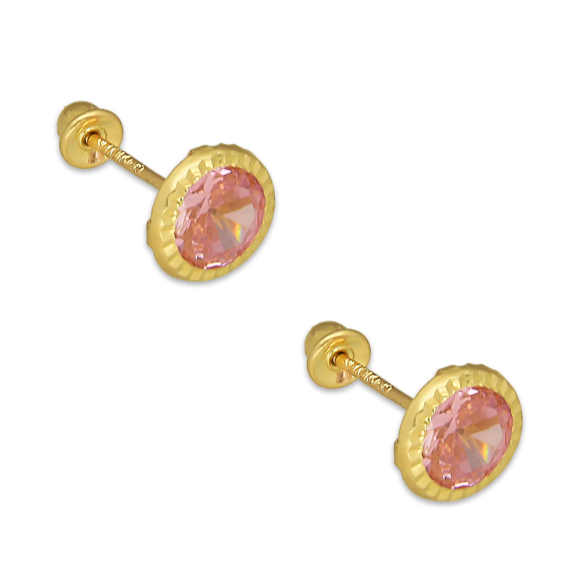 MR14AB014 Arete Broquel Oro Sólido 14K Modelo Zirconia Rosa Redonda con Bisel Diamantado 6 mm de Diámetro