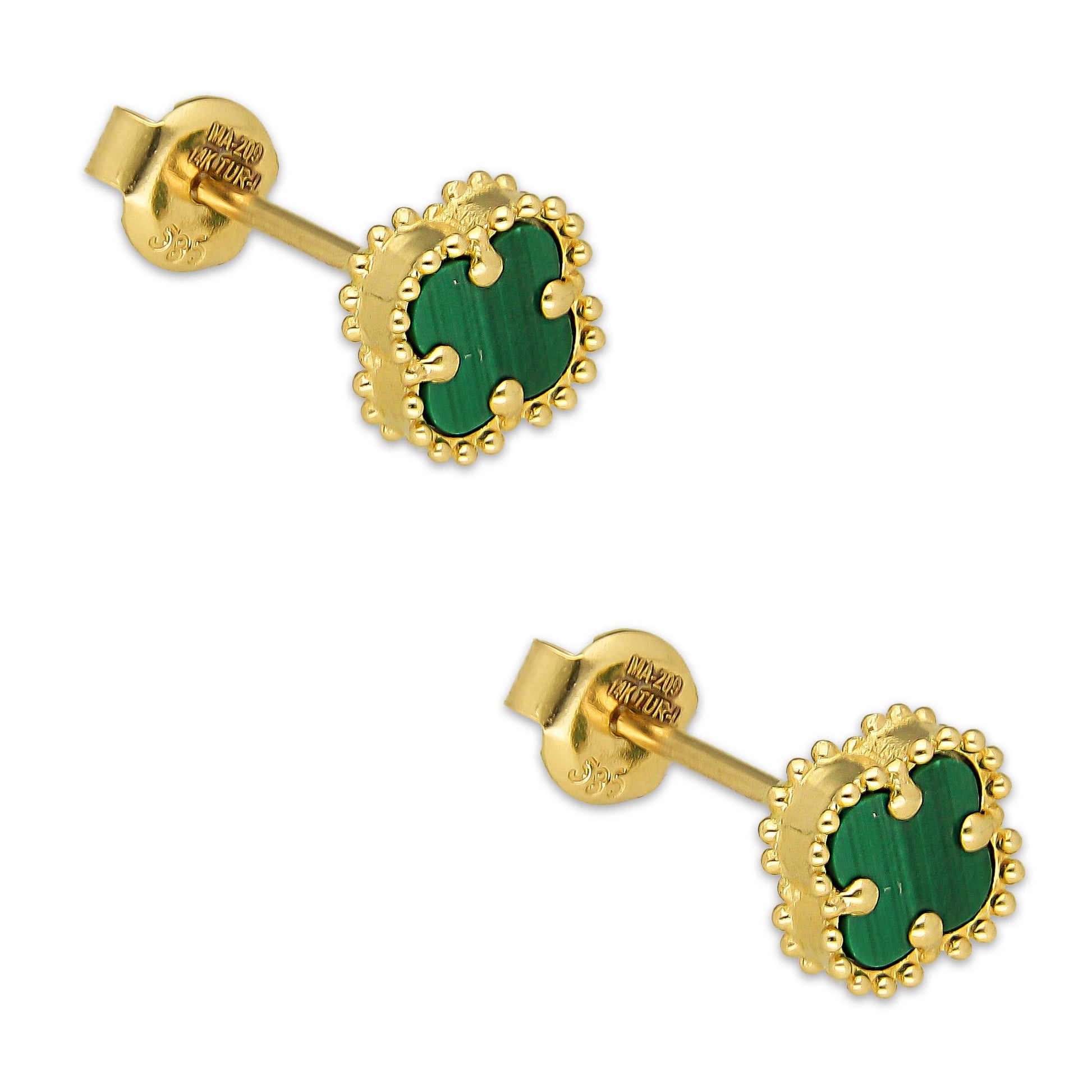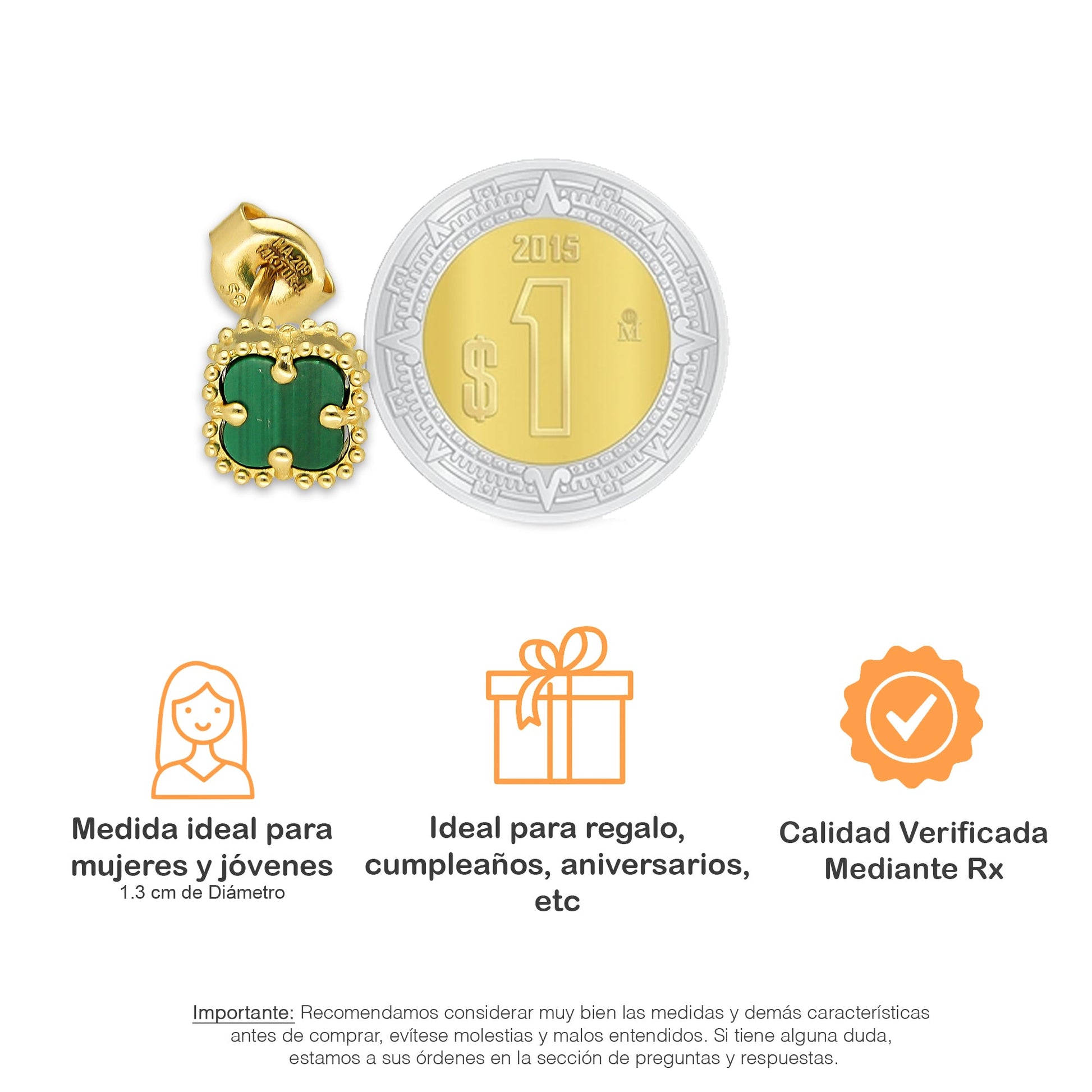 MR14AB016 Arete Broquel Oro Sólido 14K Modelo Trébol 8 mm Verde Diámetro 1.3 cm