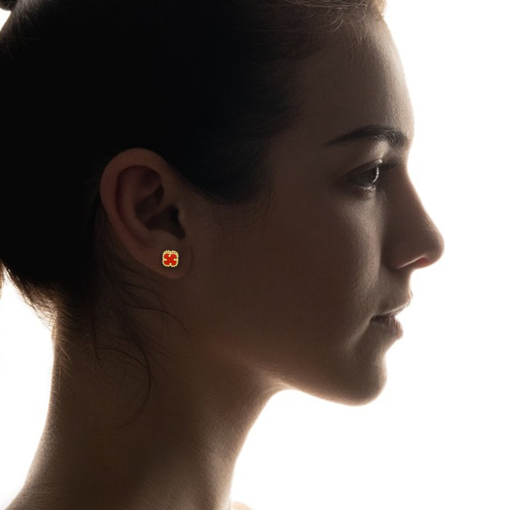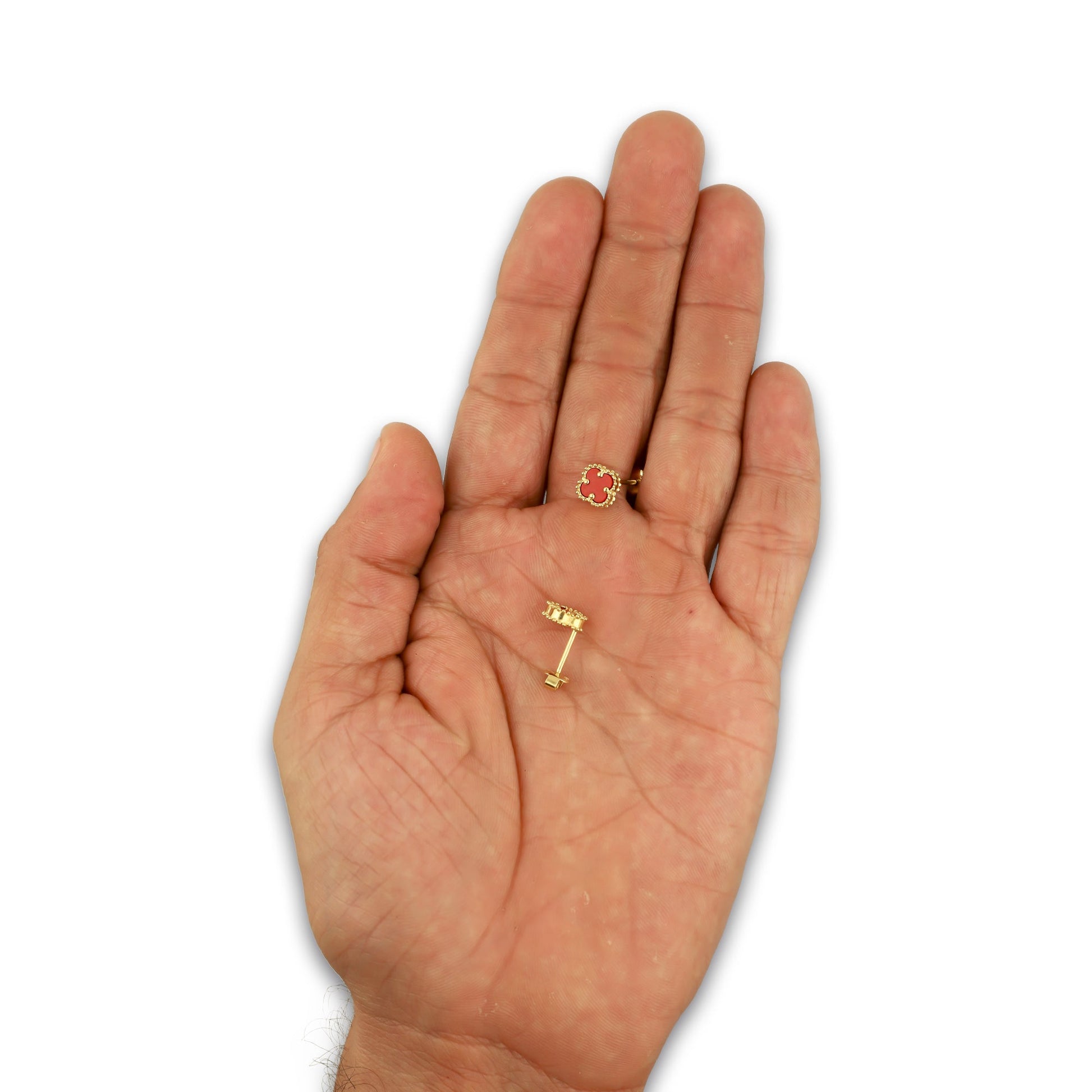 MR14AB020 Arete Broquel Oro Sólido 14K Modelo Trébol 8 mm Rojo Diámetro 1.3 cm