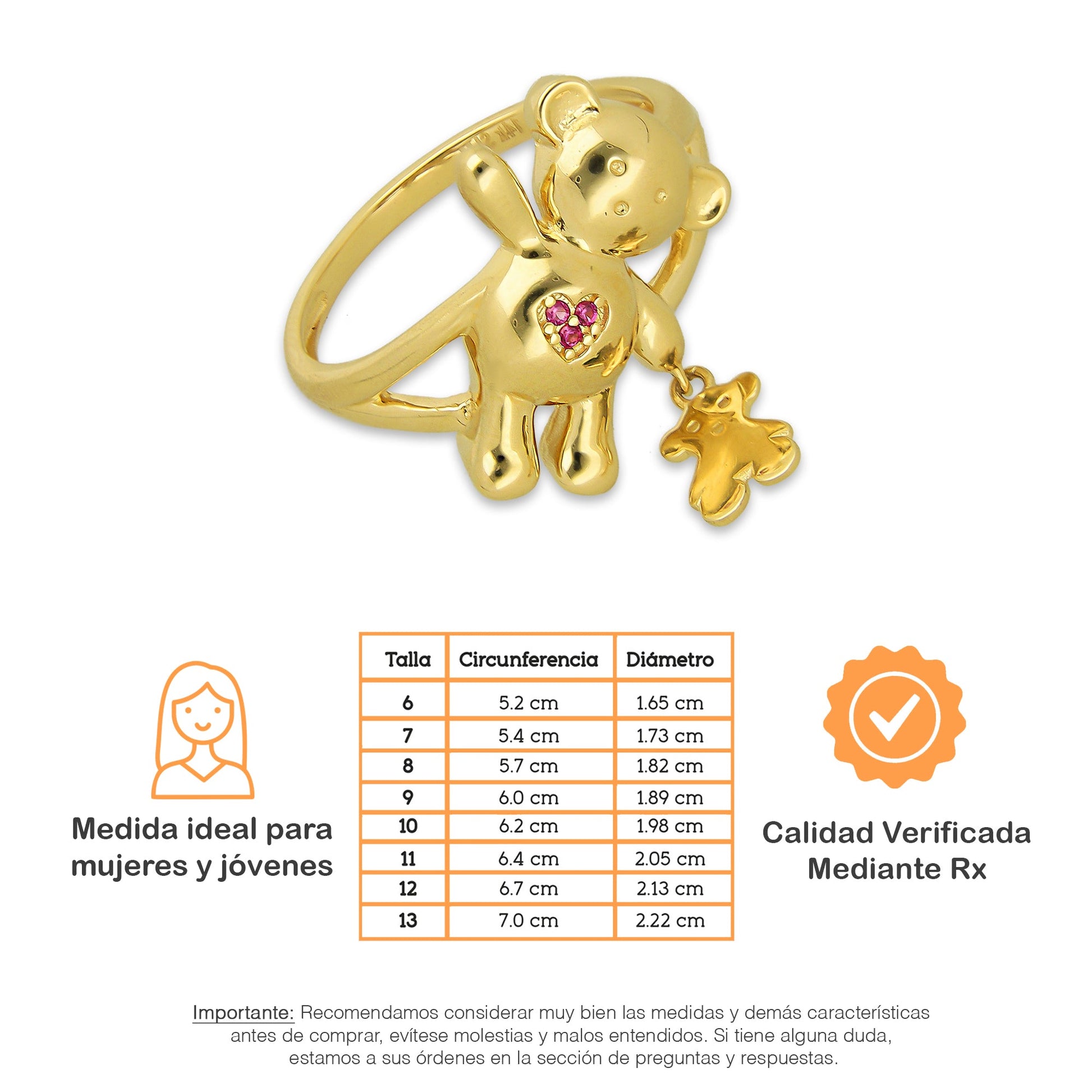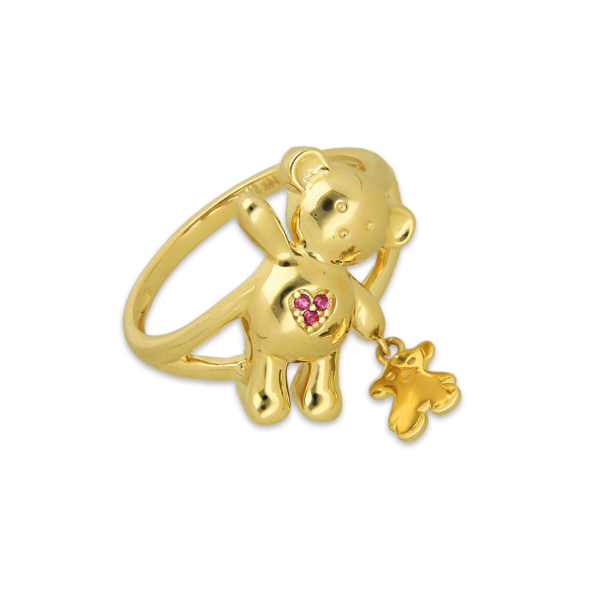 MR14AD044 Anillo Dama Oro Sólido 14K Modelo Oso Corazón Rojo con Osito Colgante